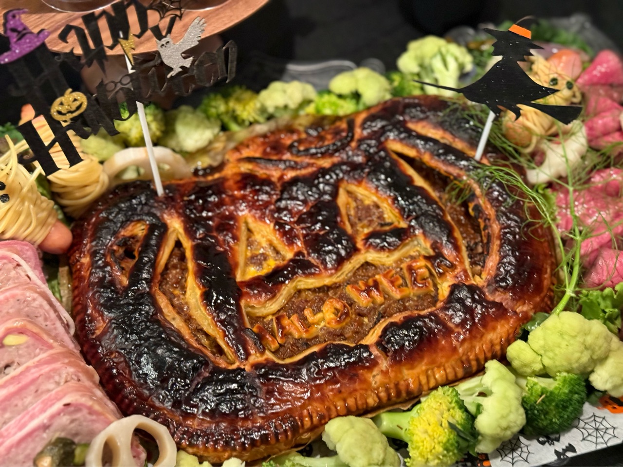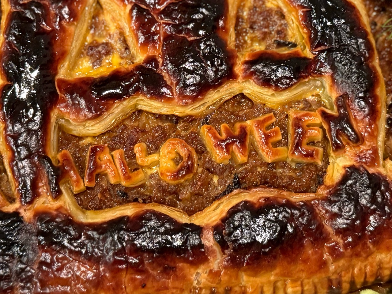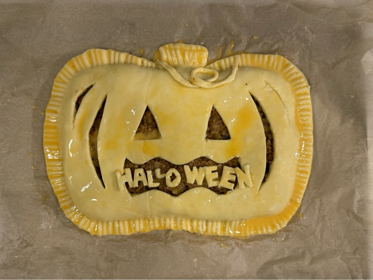こんな感じで、ジャックオランタンの形のミートパイを作ってオーブンで焼いて良い感じに出来てたんです✨
