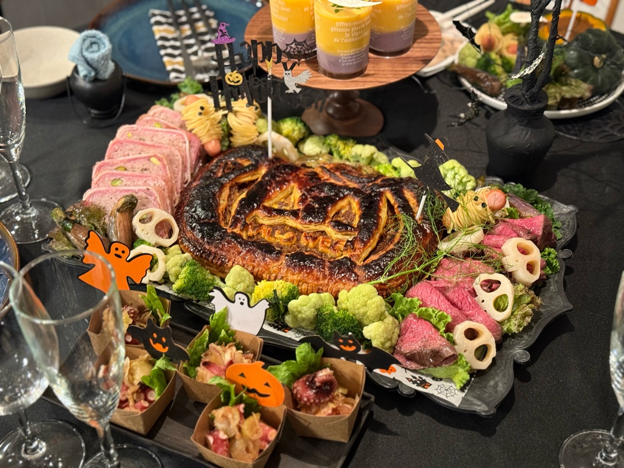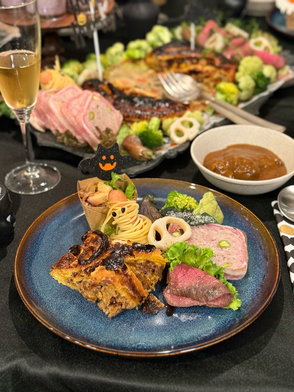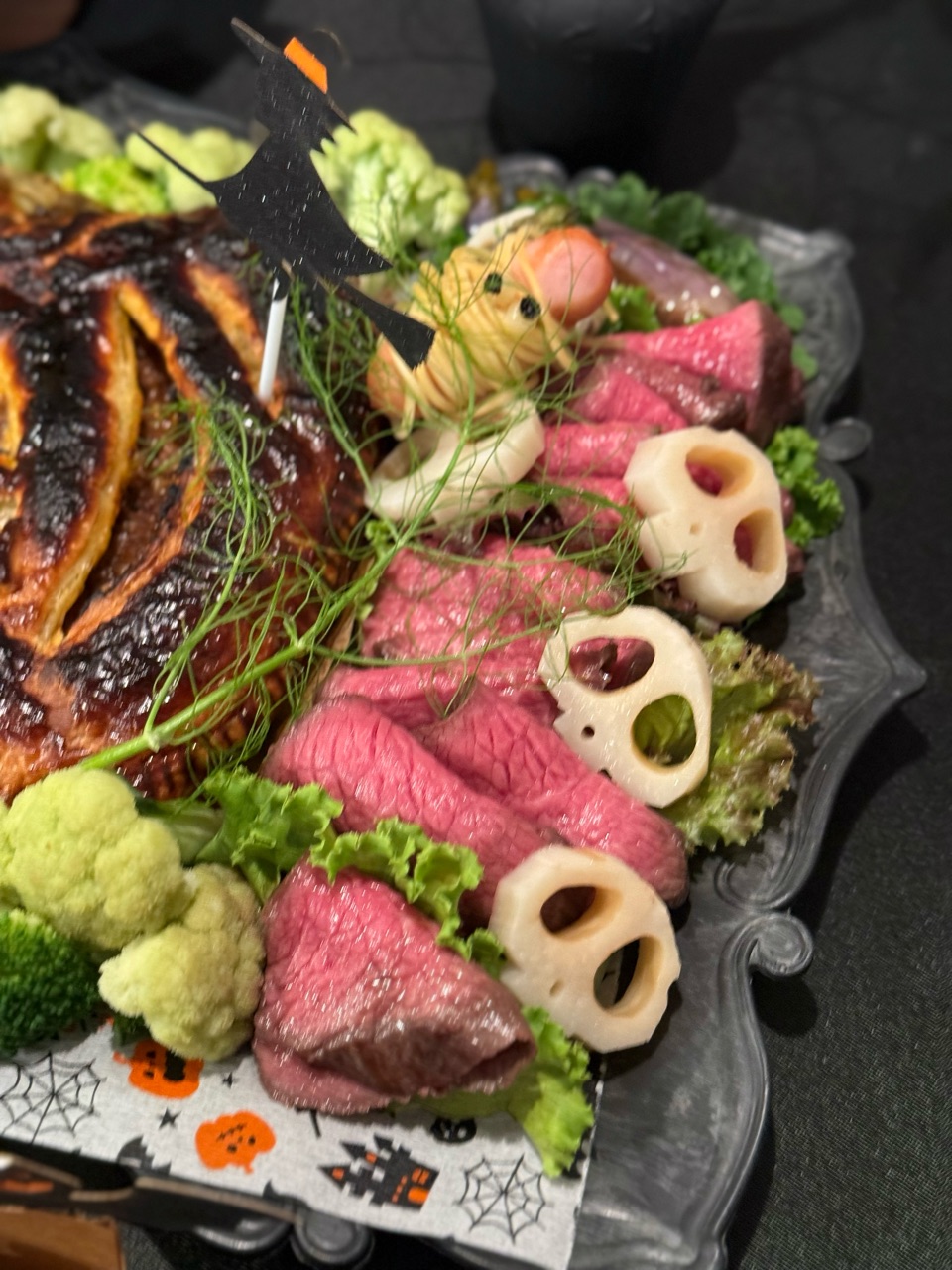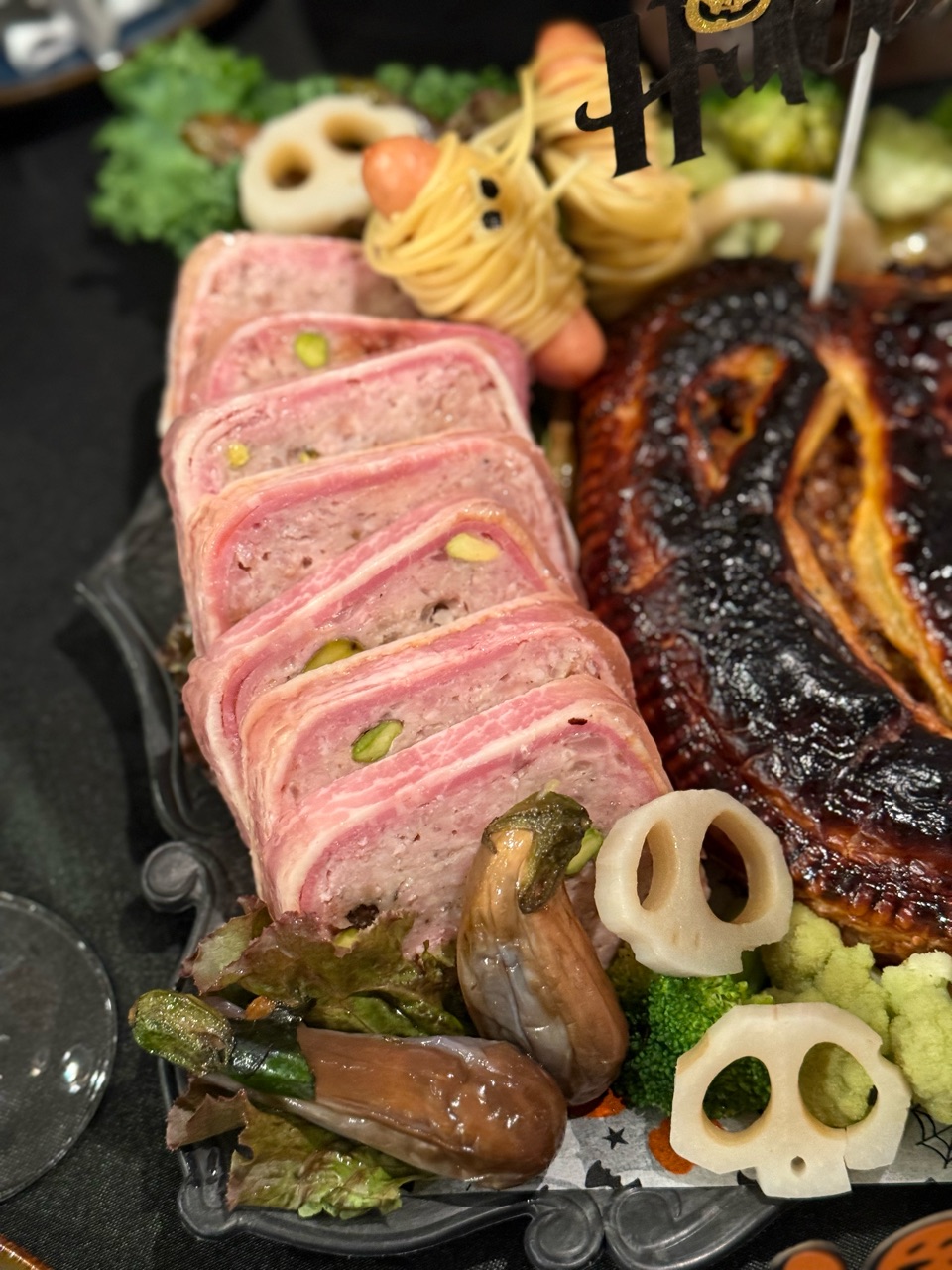 ローストビーフやミイラウインナーを周りに飾りました。