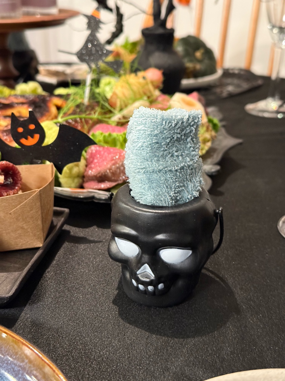 お手拭きをドクロに入れたら雰囲気出るー💀