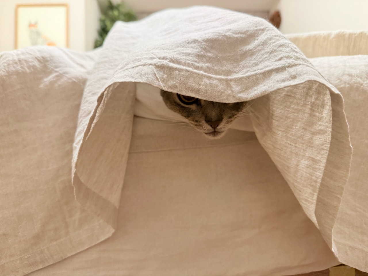 誰もいなくなったことに未だ気付いていないわか坊は、シーツの中でワクワクしている。