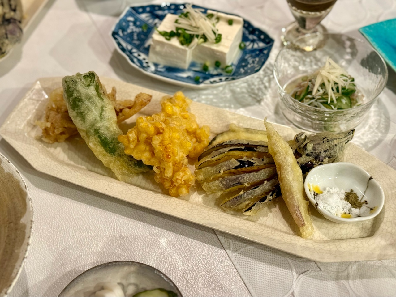 茄子、茗荷、舞茸、シシトウ、とうもろこしのかき揚げです。