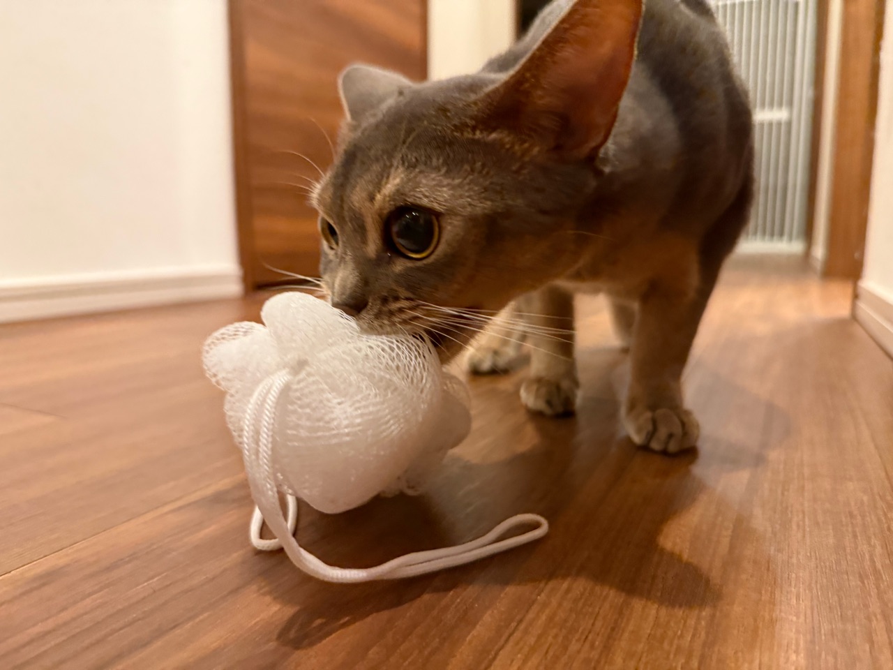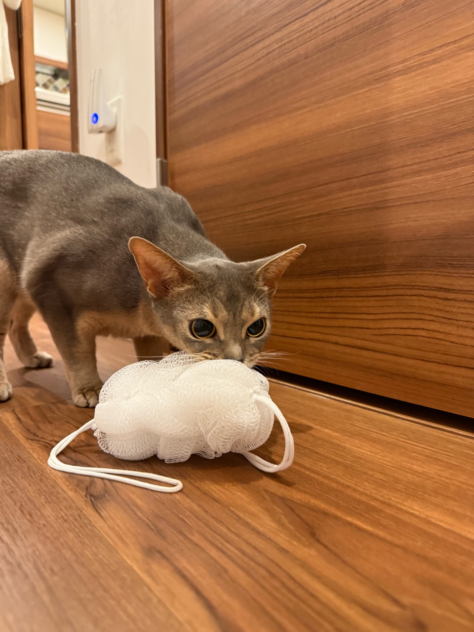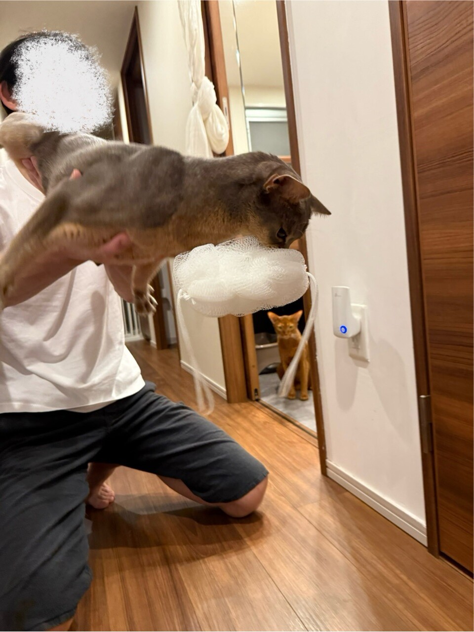 お風呂に入っていると、ドアの向こうでわか坊が遊んで欲しそうに待機する。