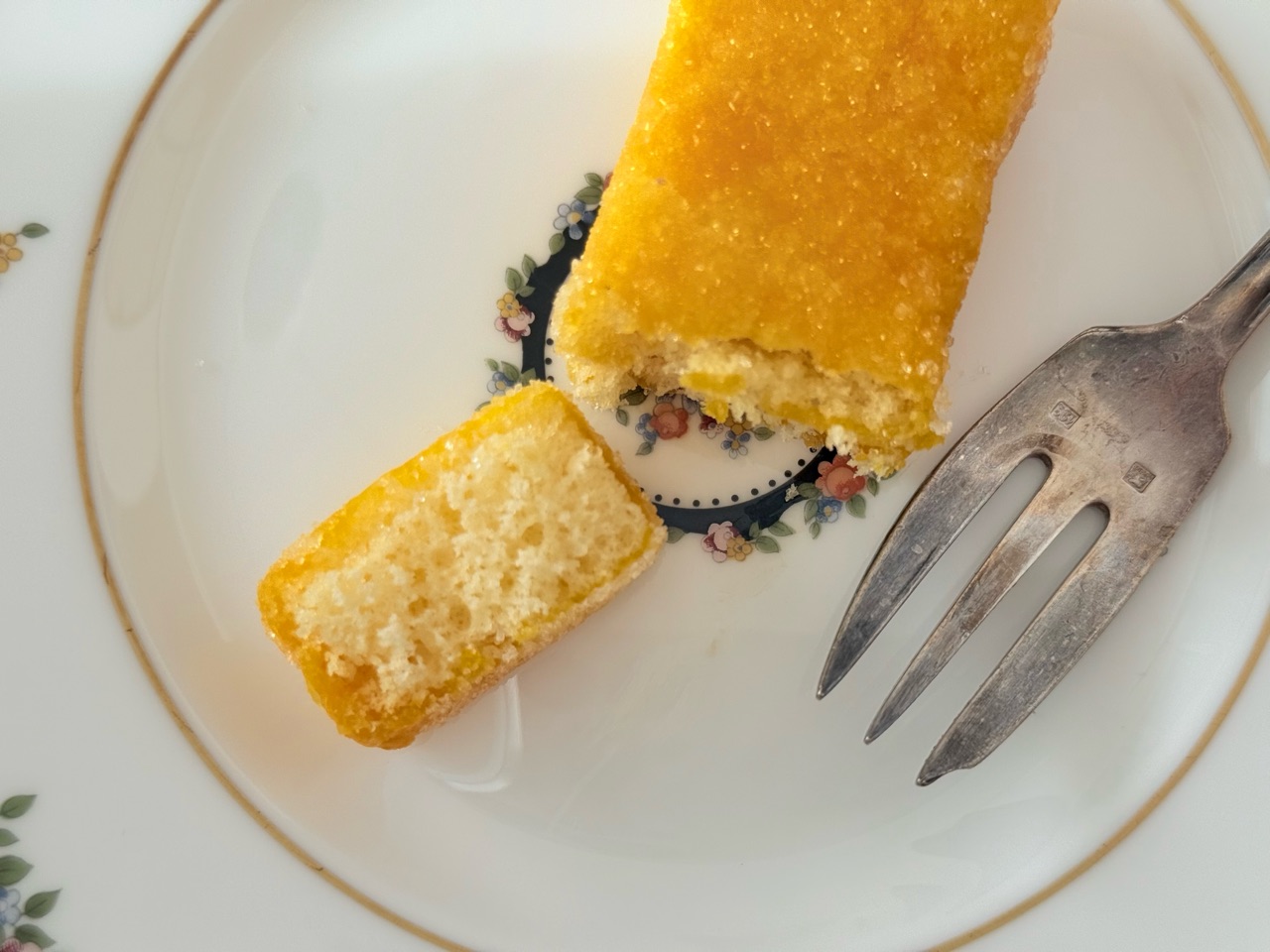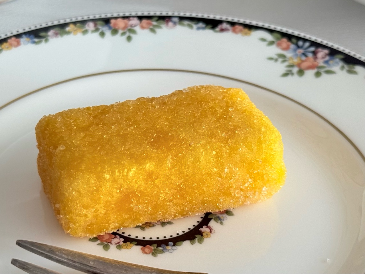 中のカステラ生地は甘味が抑えられて、周りのグラニュー糖のザラザラした感じと卵の黄身ととても合います。