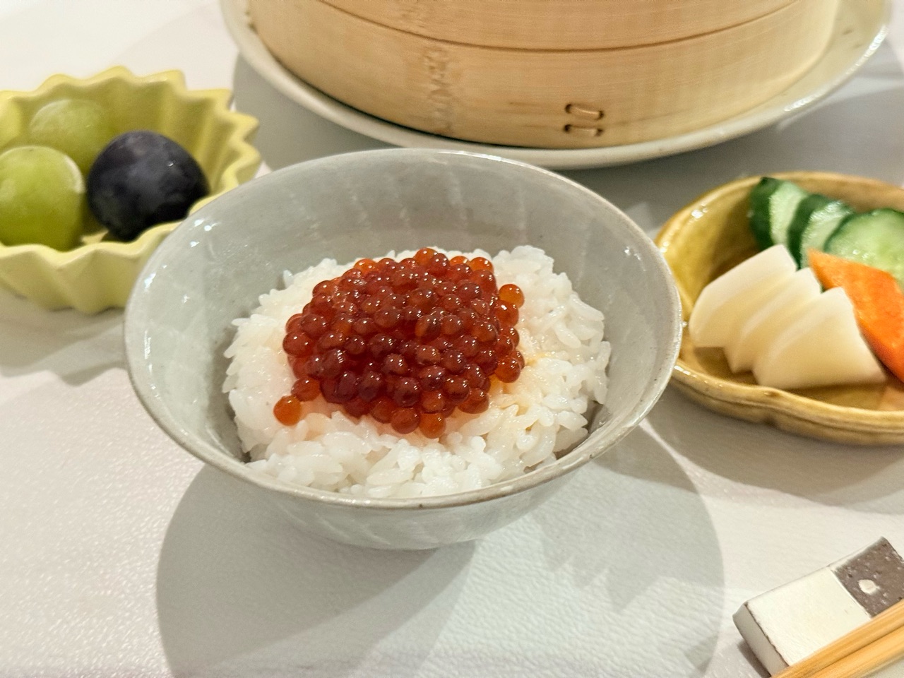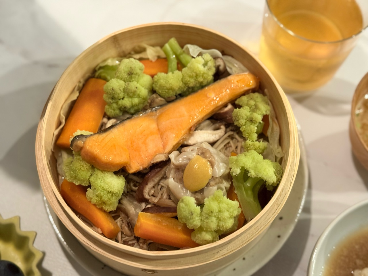 あとは、にんじん、しいたけ、カリフラワーを乗っけて、鮭とシュウマイ1個乗っけて蒸しました。