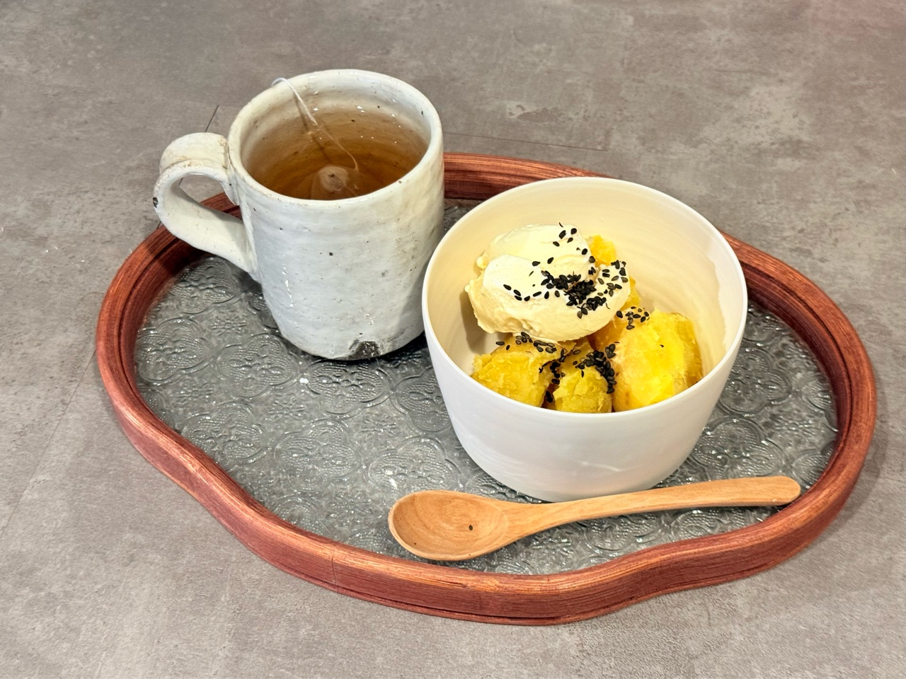 器に焼き芋をいれて、ハーゲンダッツのバニラアイスを乗っけて食べた。