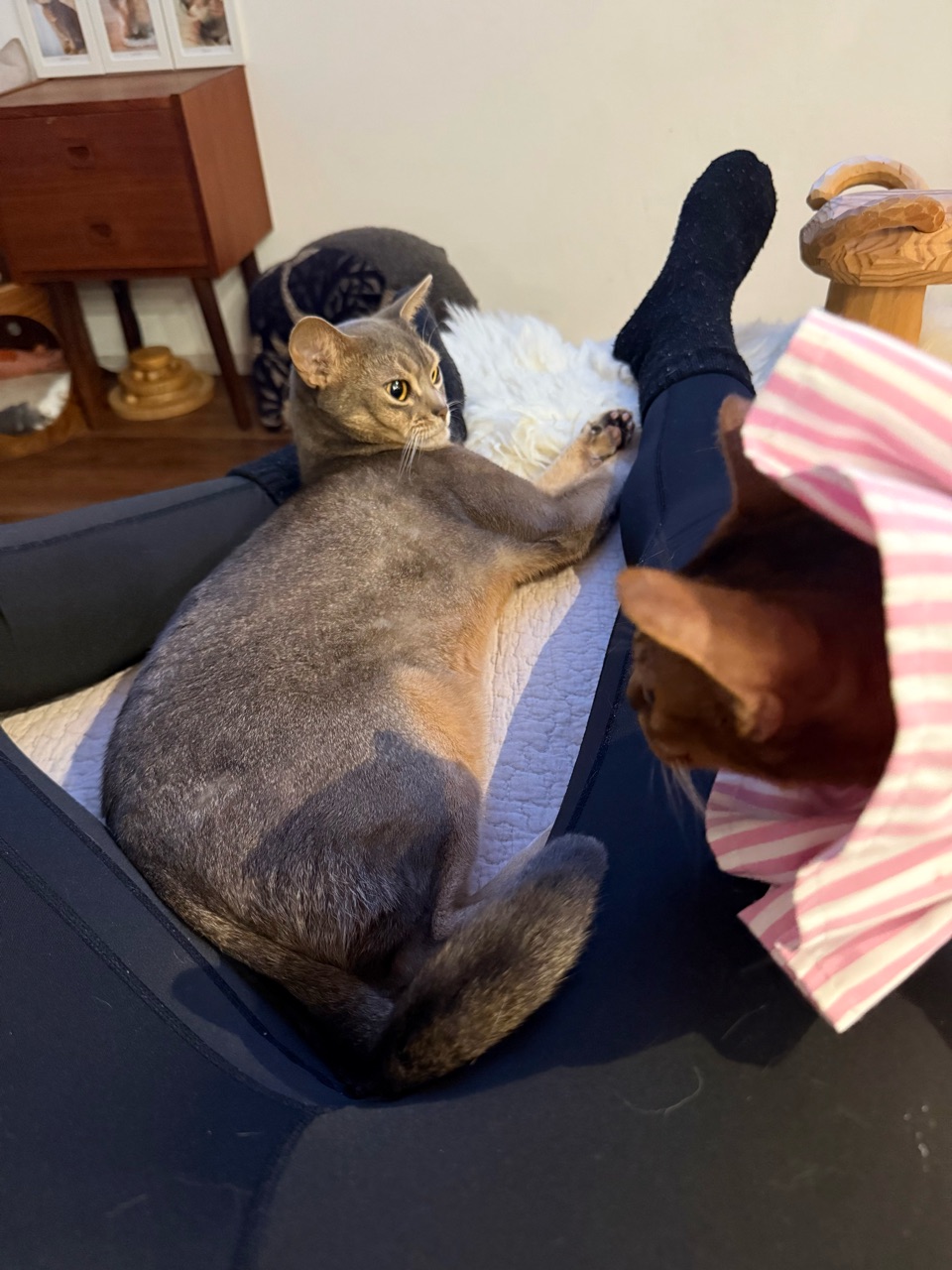 何も知らずにしっぽを守られて胸の上で落ち着くりすと、りすの尻尾を狙ってわちゃわちゃやってるわか坊。