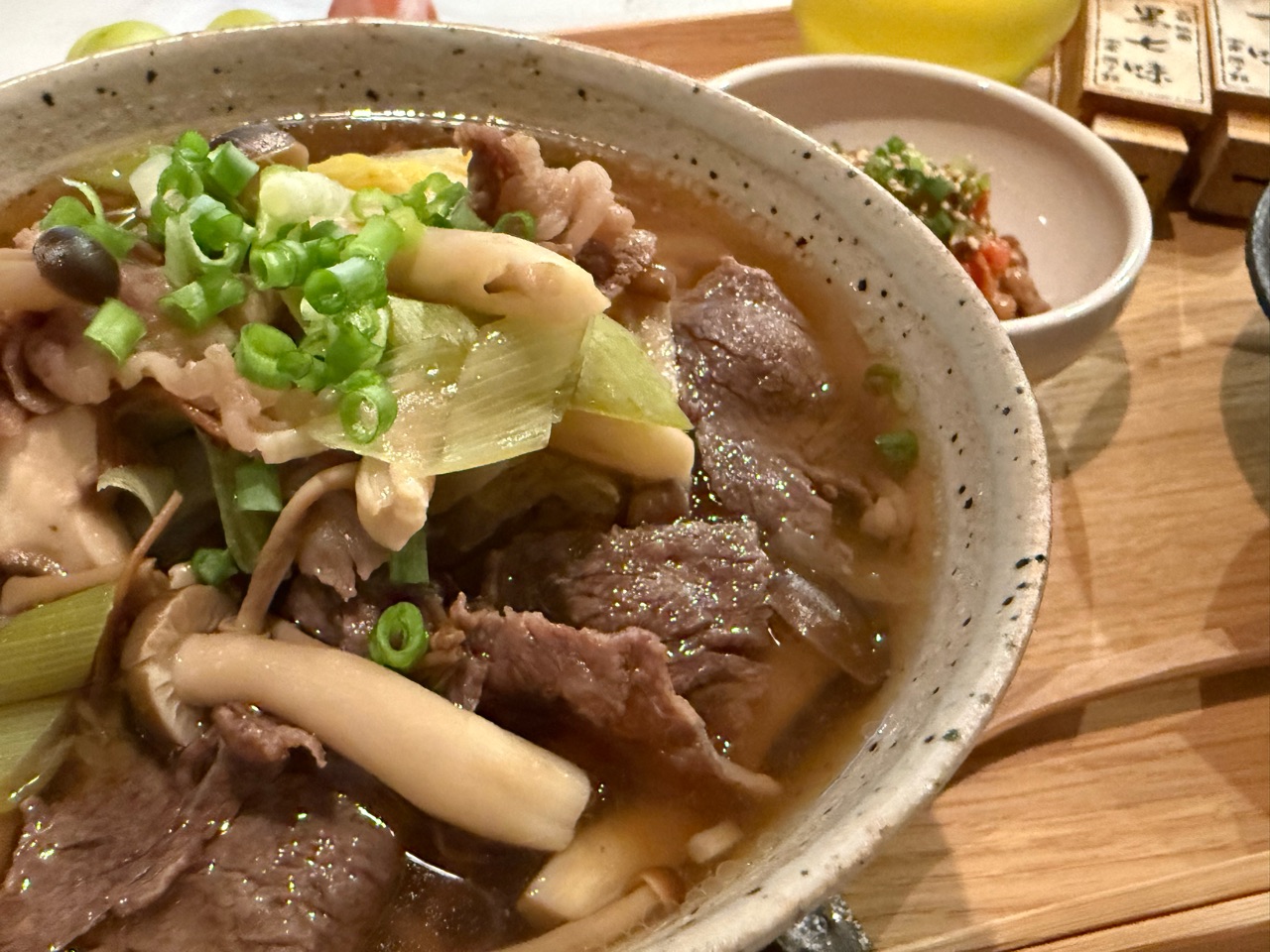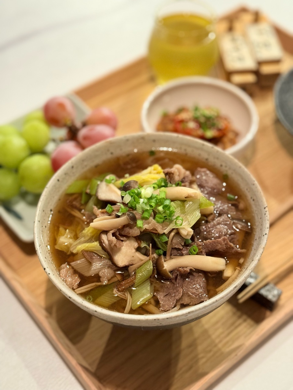 白菜、ねぎ、椎茸、しめじ、えのきだけと、赤城牛の切り落としを入れました。