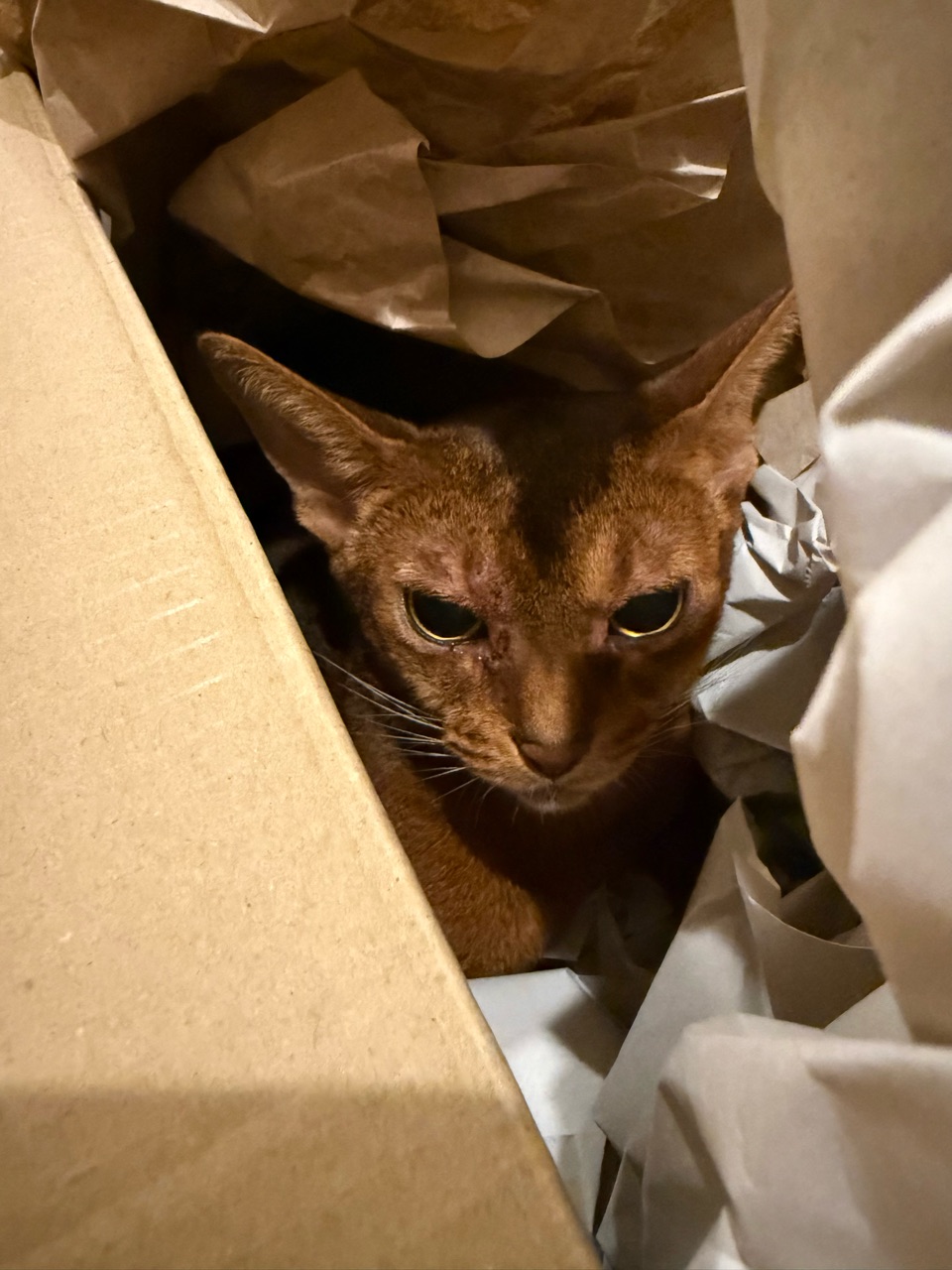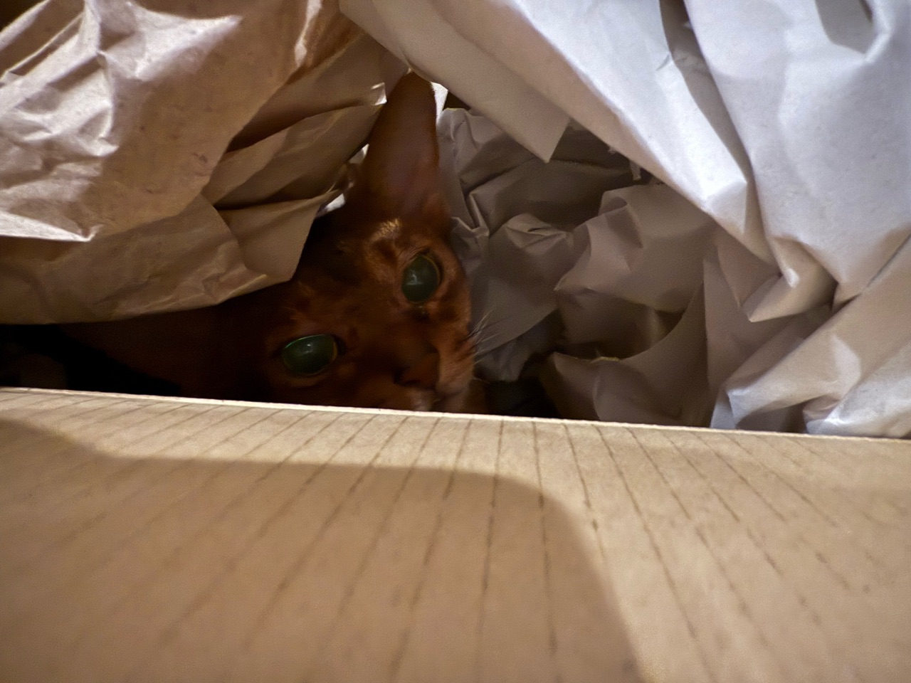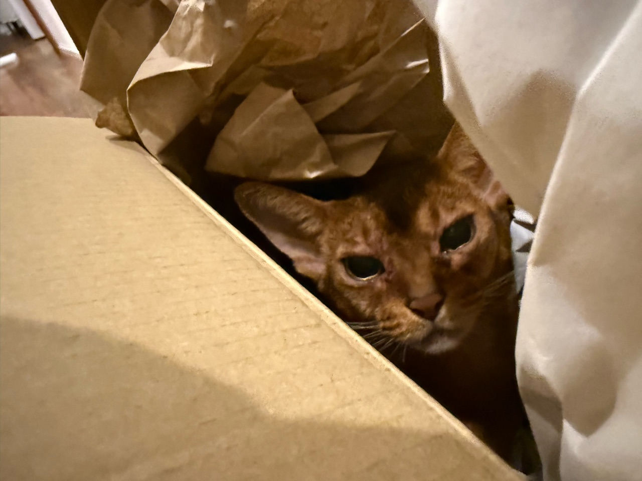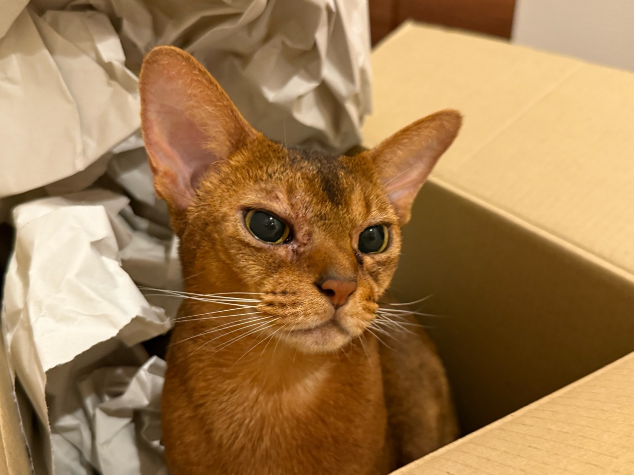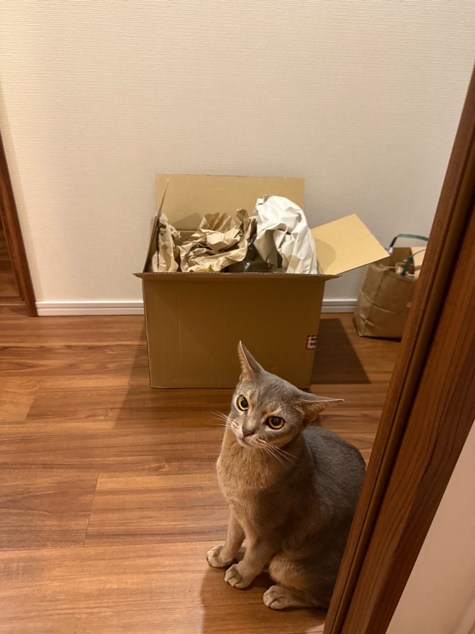 ダンボールの中の梱包材が動いてる…