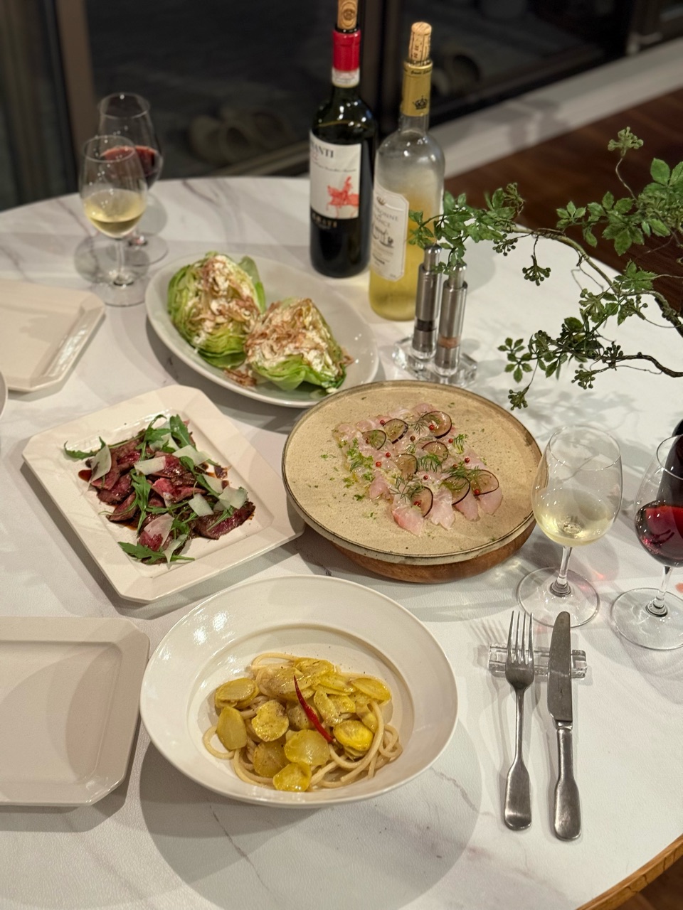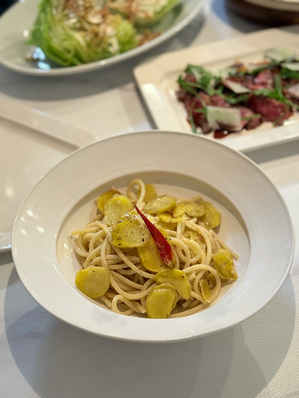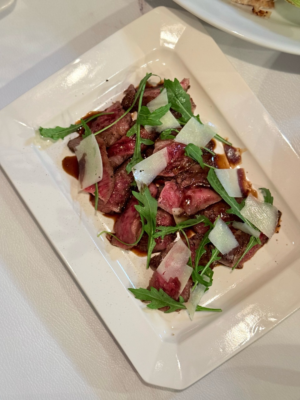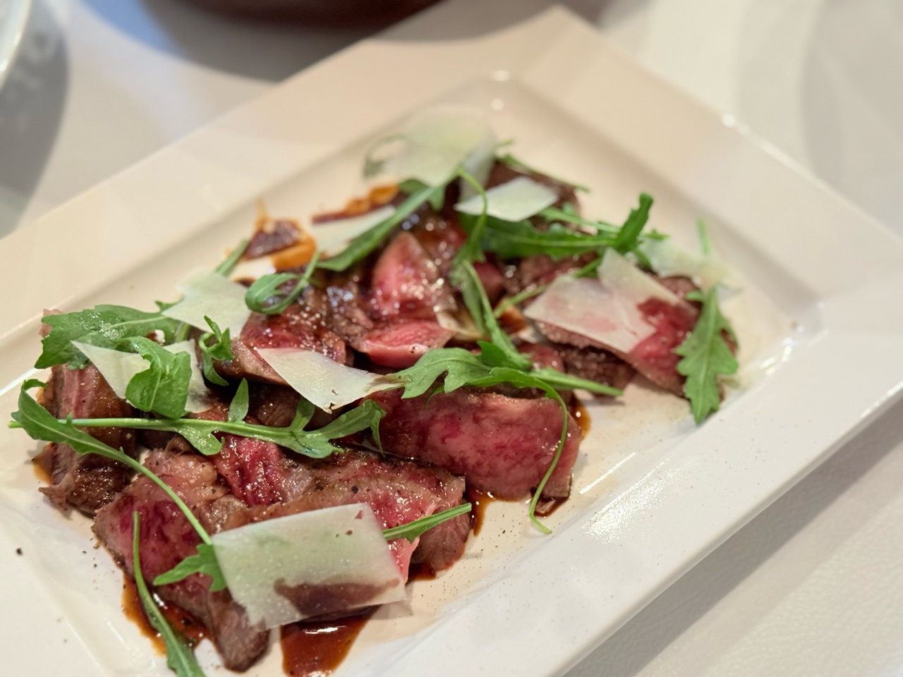 タリアータは、焼き上げた牛肉を薄くスライスし、削りたてのパルミジャーノチーズと新鮮な野菜を添えて楽しむトスカーナ地方のお料理だそう。