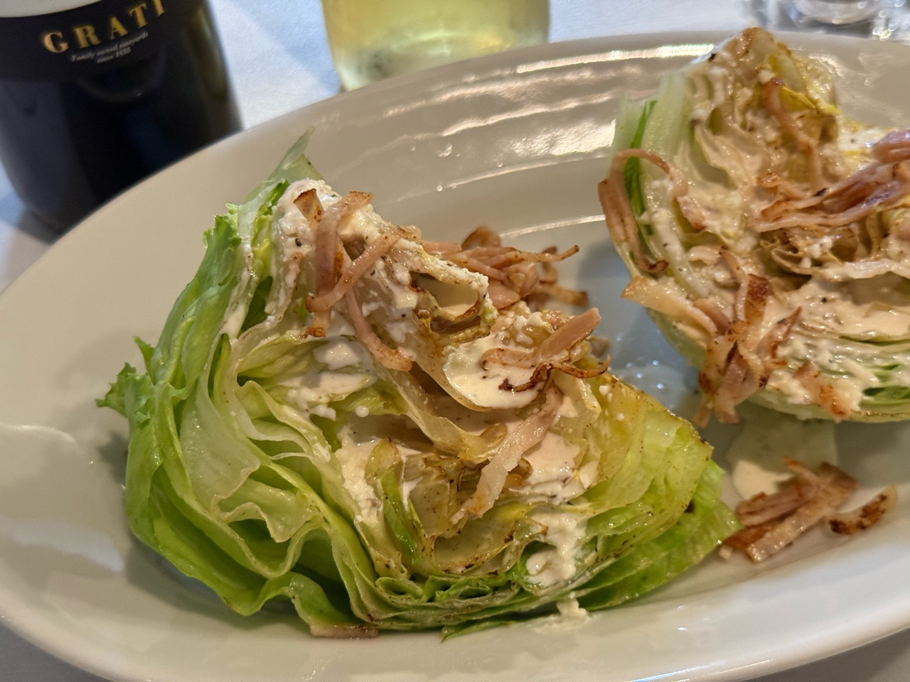 レタスの1/4切りをサッと焼いて、カリカリベーコンとシーザーサラダドレッシングをかけてあります。