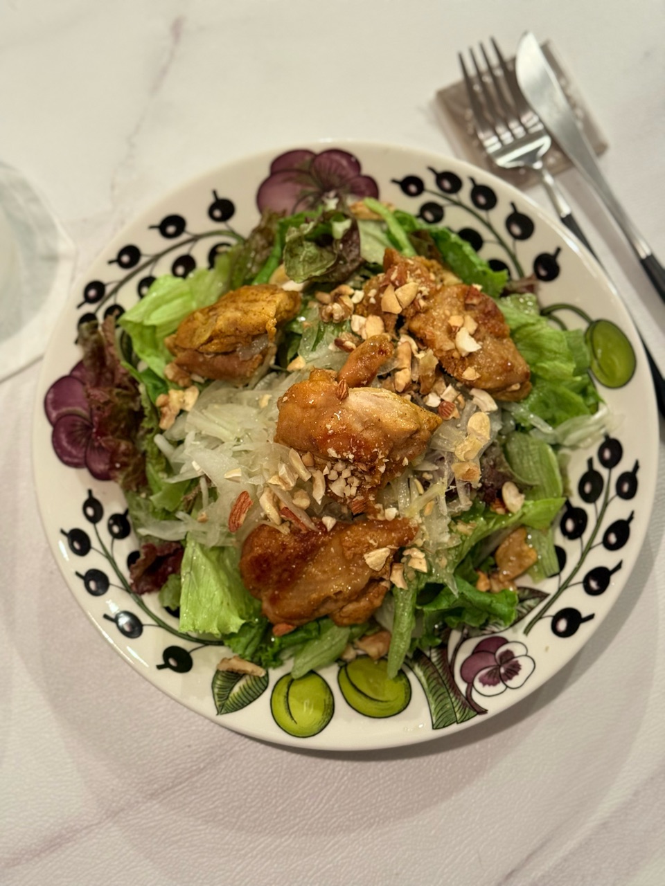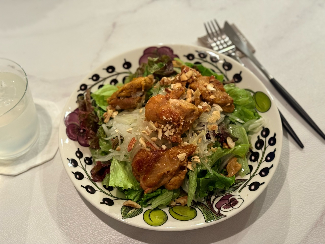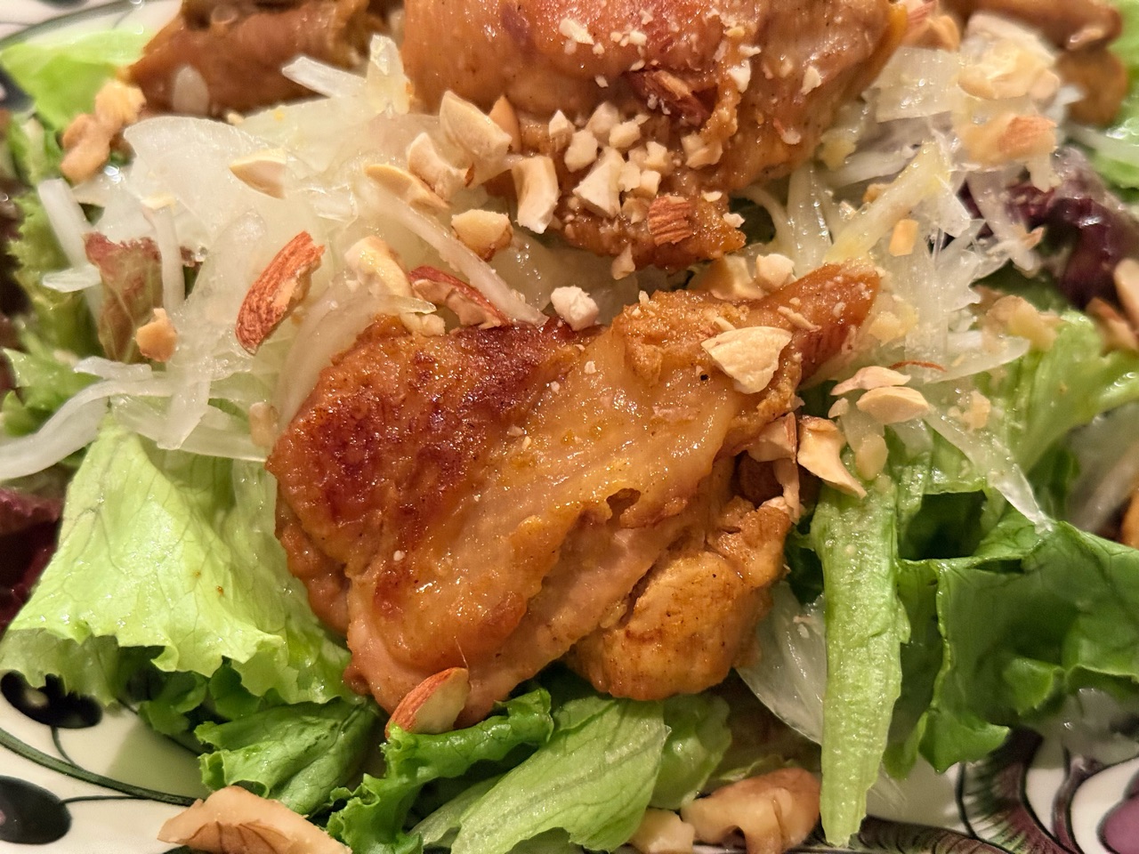 レタスとスライスオニオンに、りんご酢、オリーブオイル、塩コショウをして全体を混ぜて、タンドリーチキンをトッピングして、砕いたナッツをかけました。
