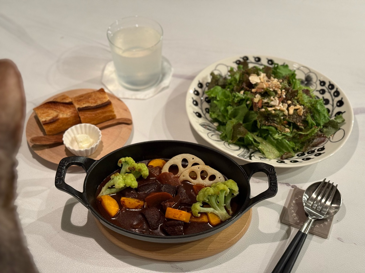 お鍋でパウチのシチューを温めている間に、レンコンやにんじん、カリフラワーをストウブのスタッカブルディシュで焼いておいて、シチューのトッピングにしました。