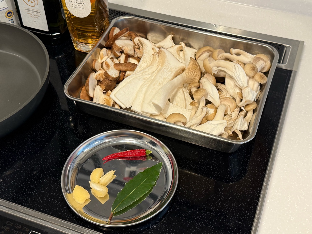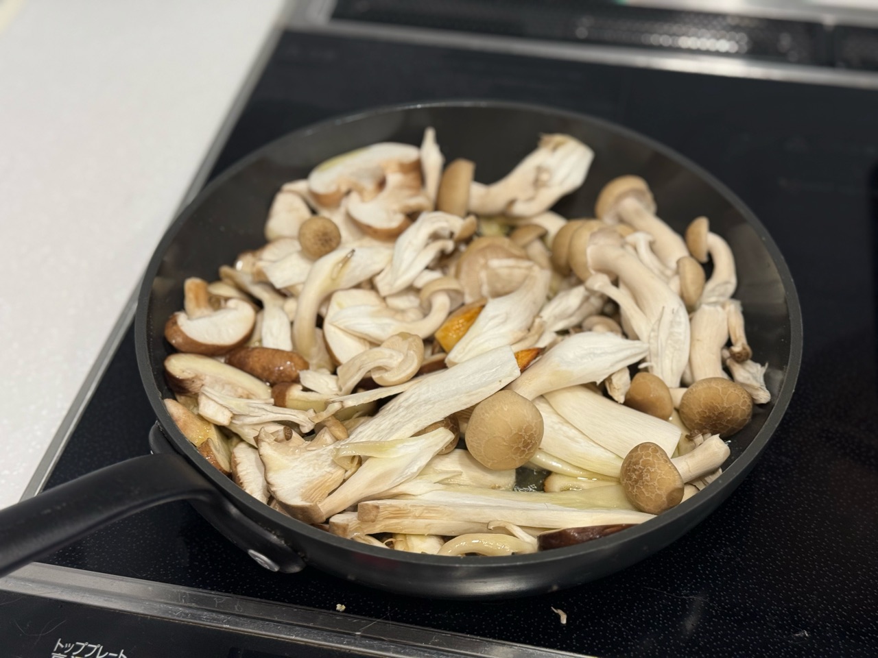 オリーブオイルにニンニクを入れて香りが出たら、キノコをドサっと入れて、あまりかき混ぜないよう焼き付けながら火を通して、