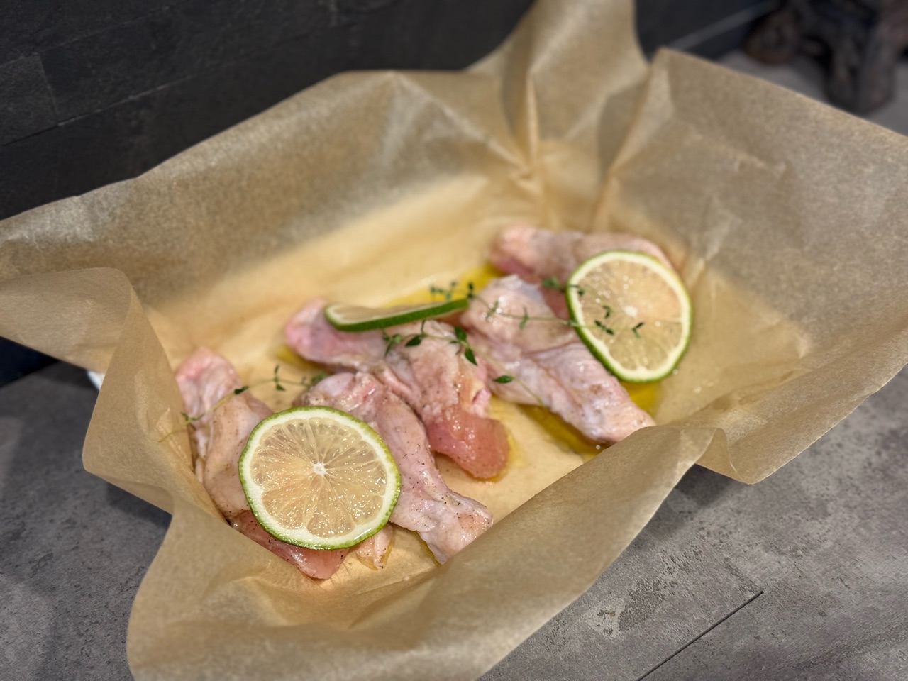 チキンのドラマスティックに塩コショウをまぶして、ワインビネガー、オリーブオイル、ニンニクでマリネします。