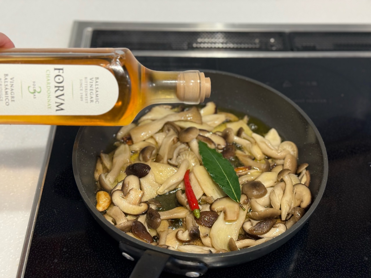 塩、ローリエ、鷹の爪をいれて、仕上げにワインビネガーを回しかけて、酸味が飛ぶまで30秒ほど火を入れて出来上がり♪