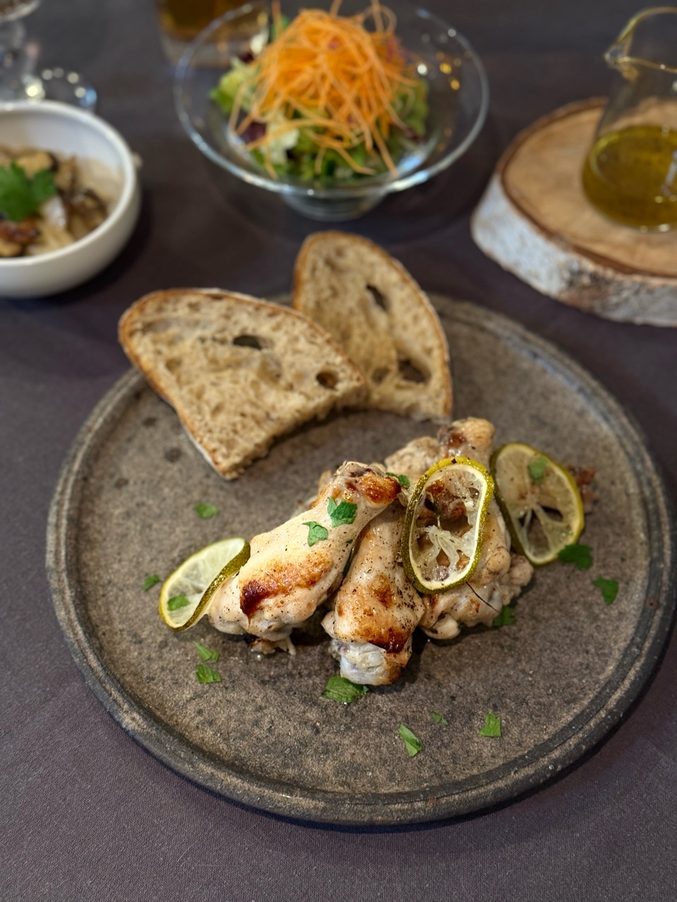 ドラムチキンのマリネと、カンパーニュ。
