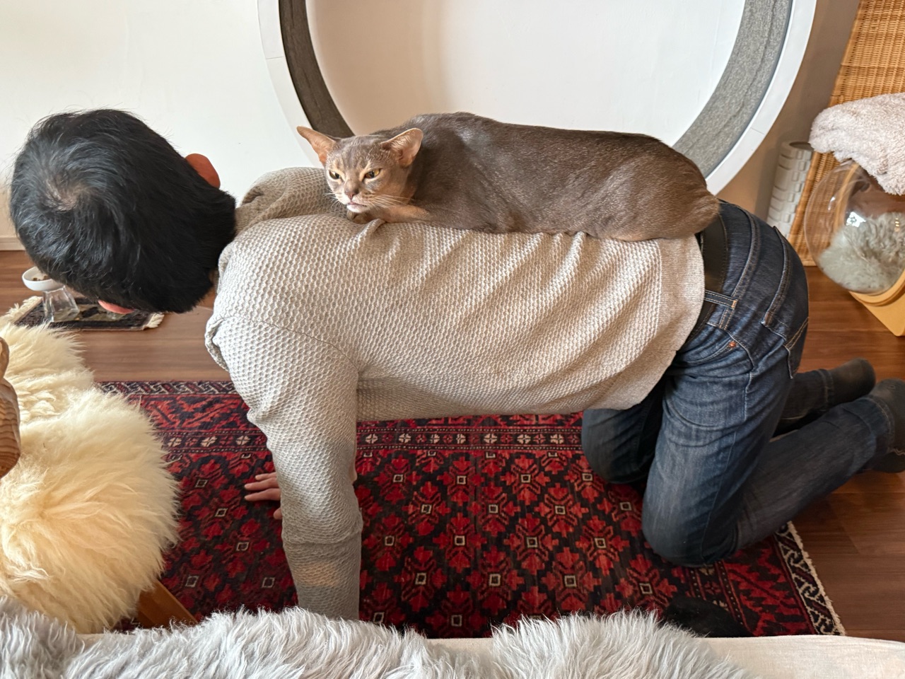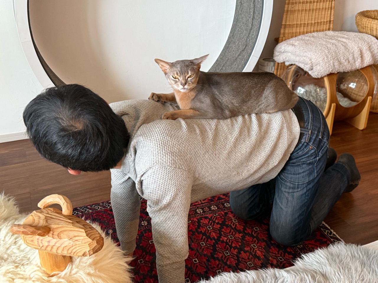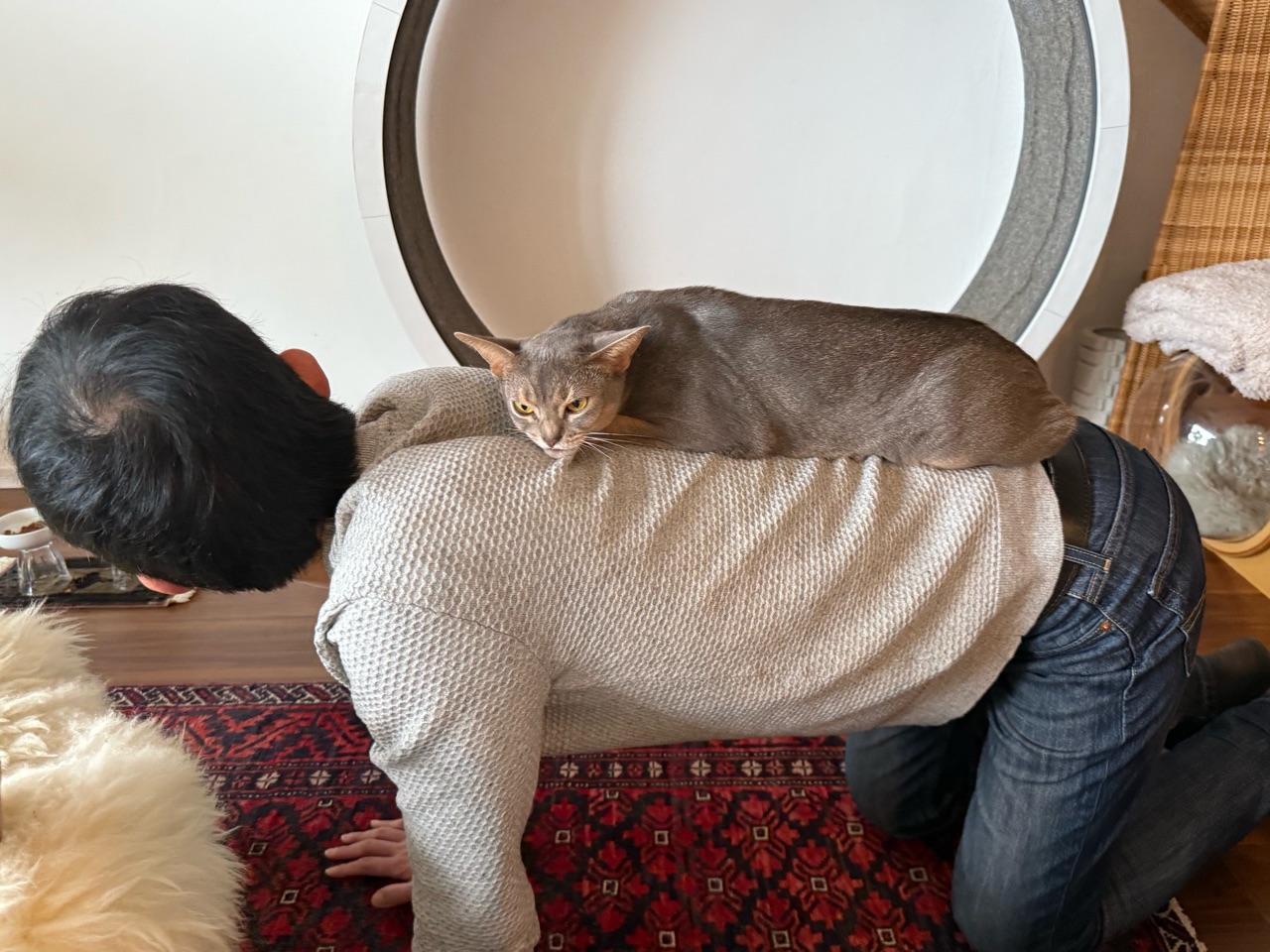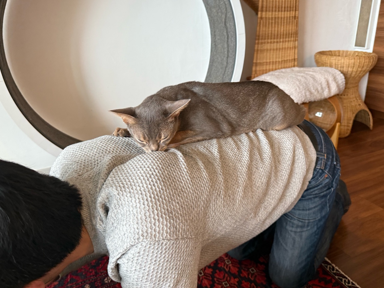 うちの場合は、テーブルから私の背中に乗り移ってきて、しばらく箱座りしています🐈️