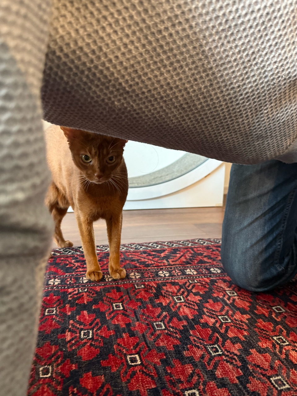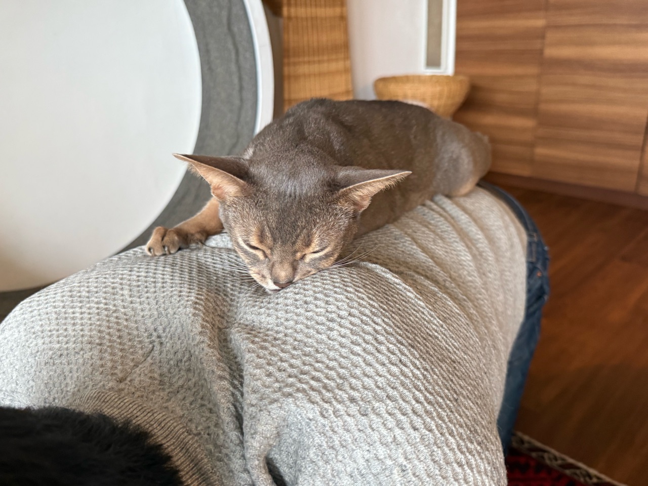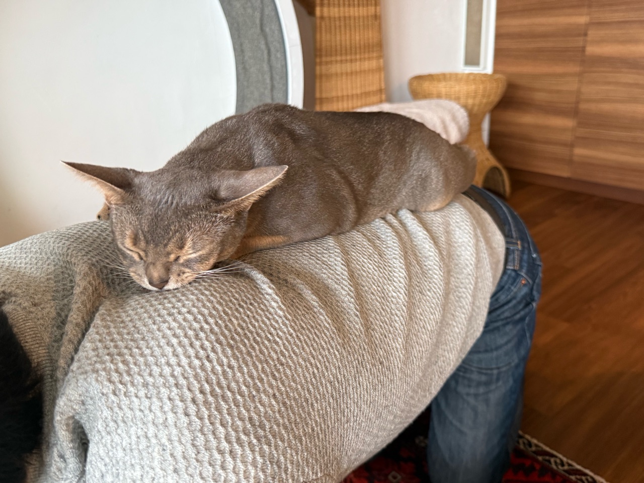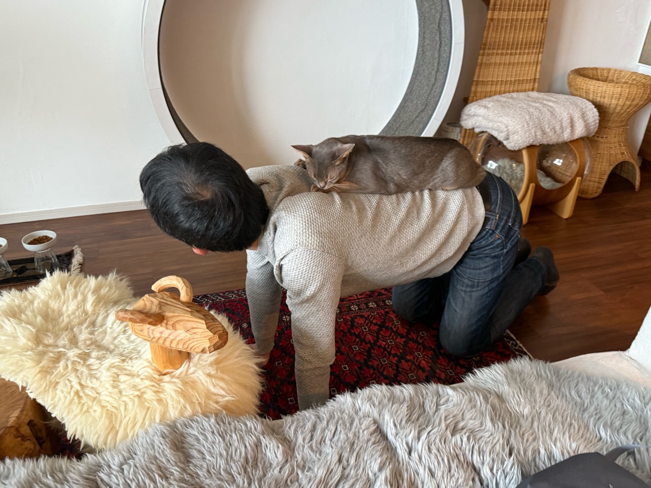 うちの場合は、テーブルから私の背中に乗り移ってきて、しばらく箱座りしています🐈️