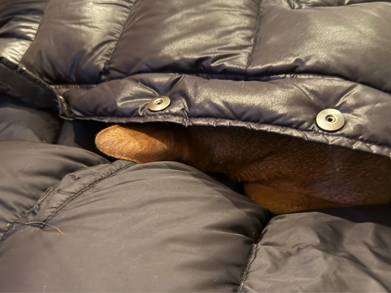 だんなさまがソファに脱ぎ捨てたダウンジャケットに潜り込んで寝ること約8時間…