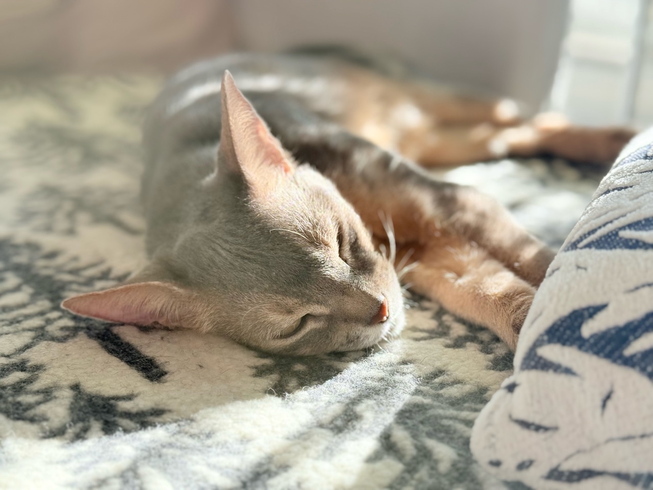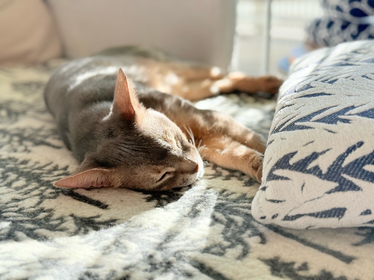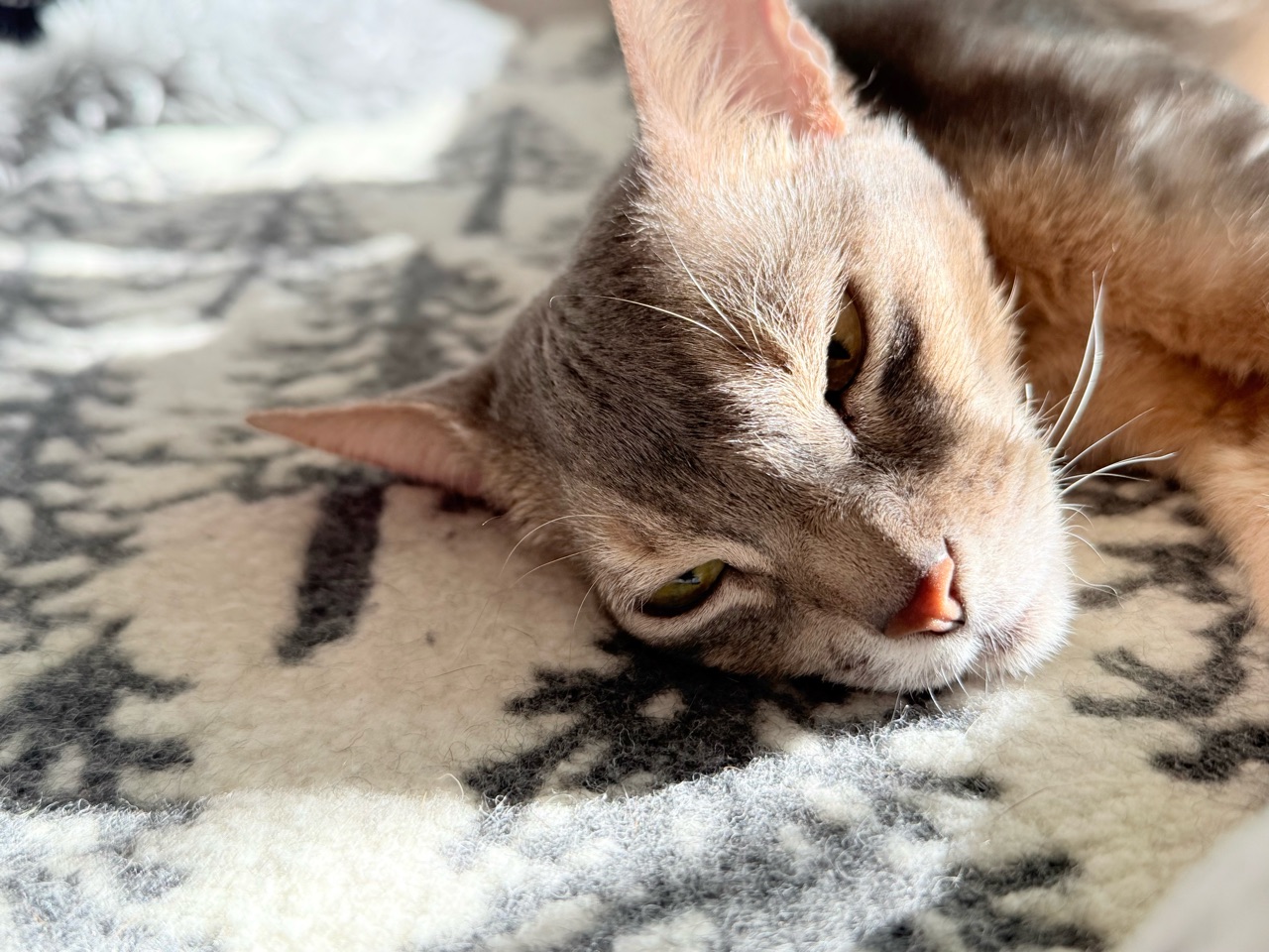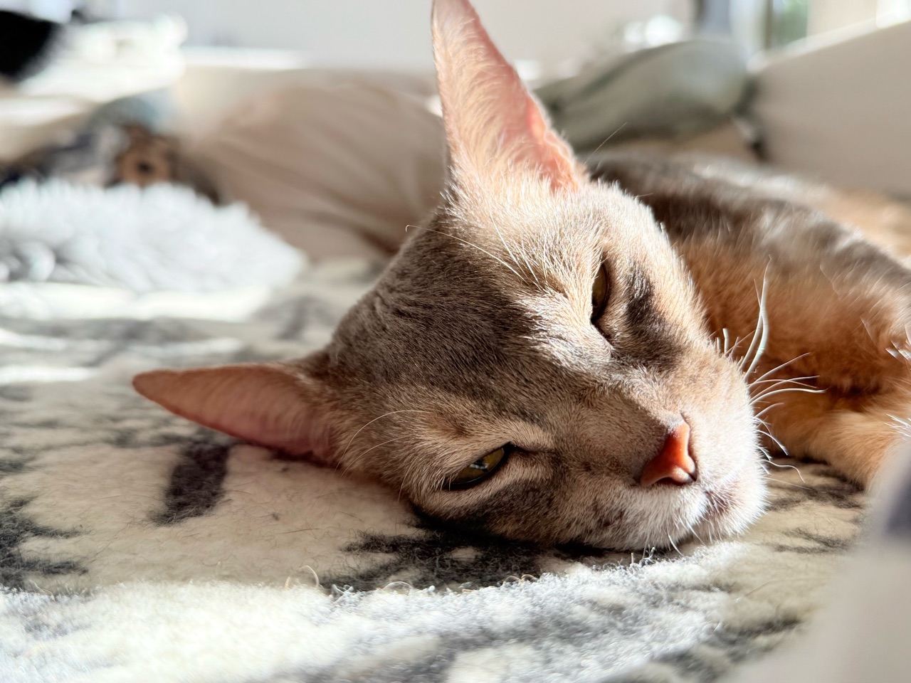 ソファーに敷いた毛布の上で横たわるぼくちん。