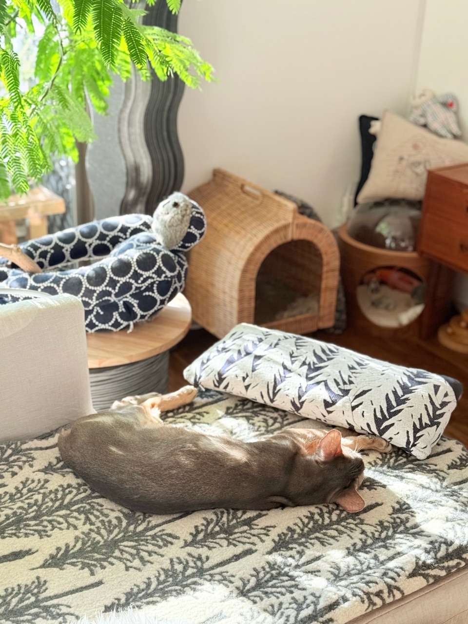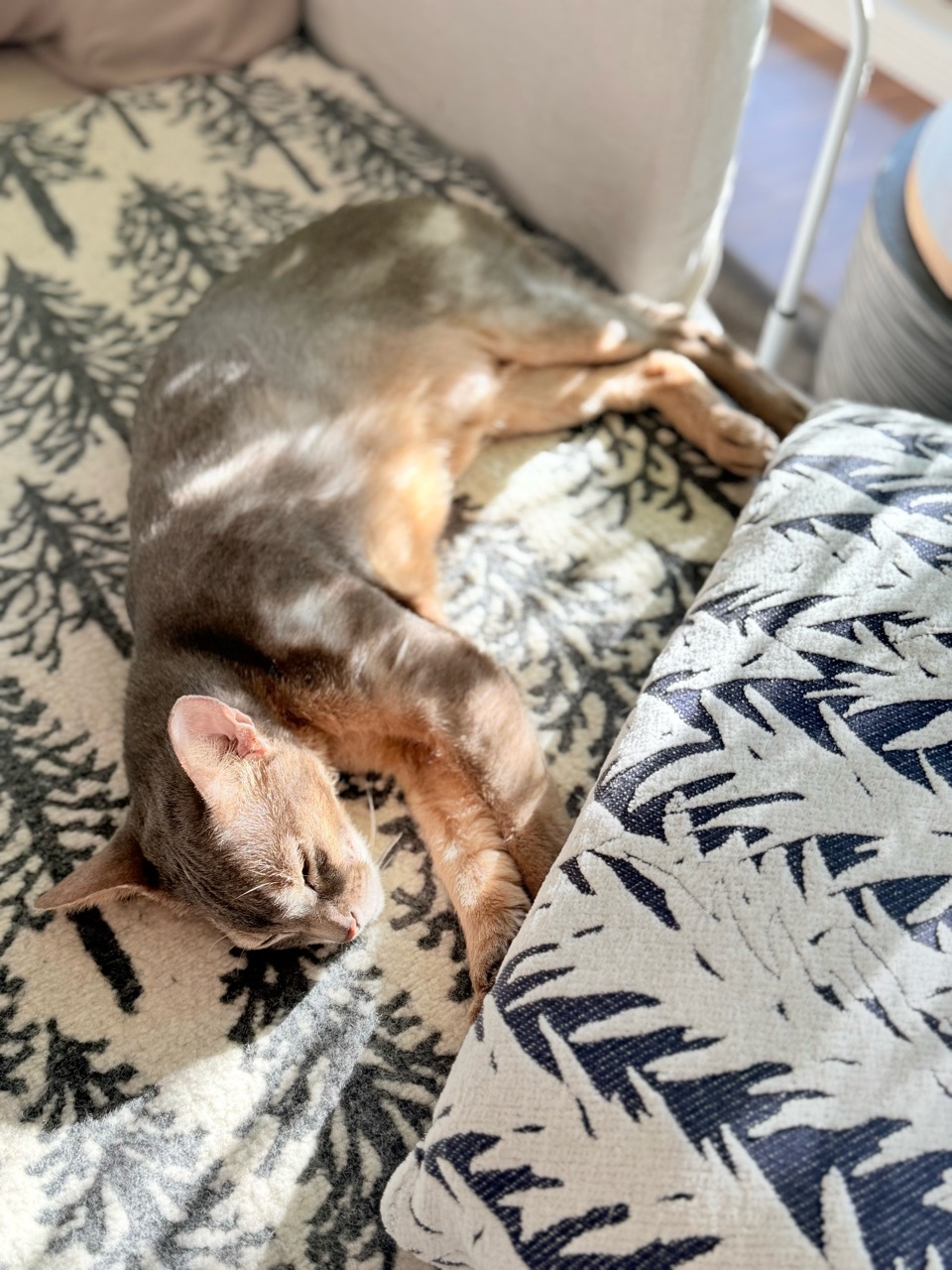 家の中の木陰で、ゆったりと眠る猫。