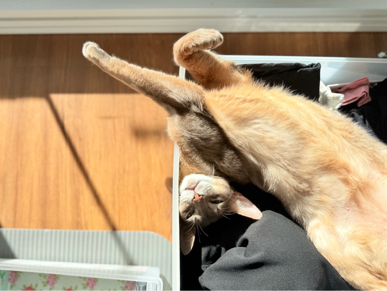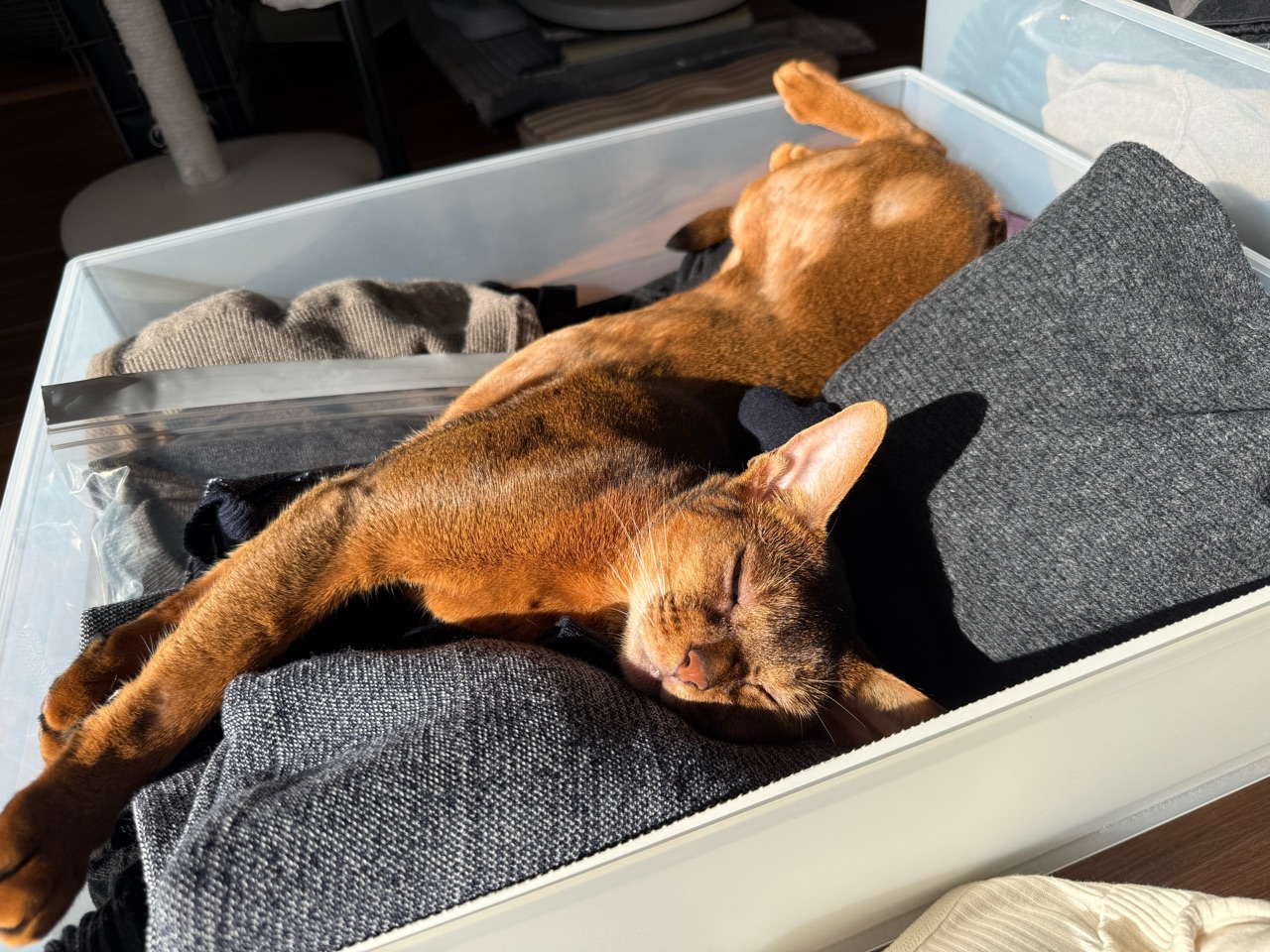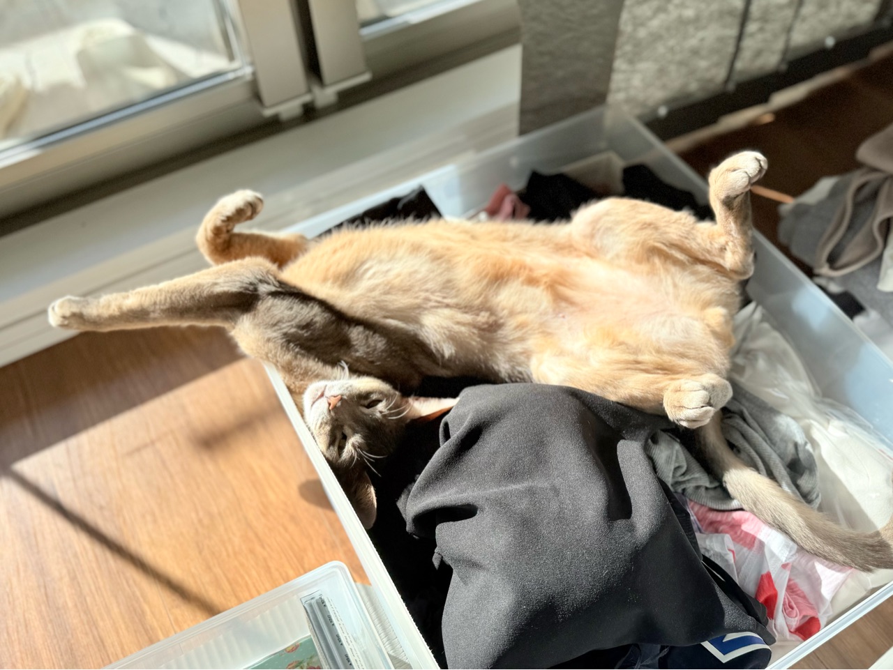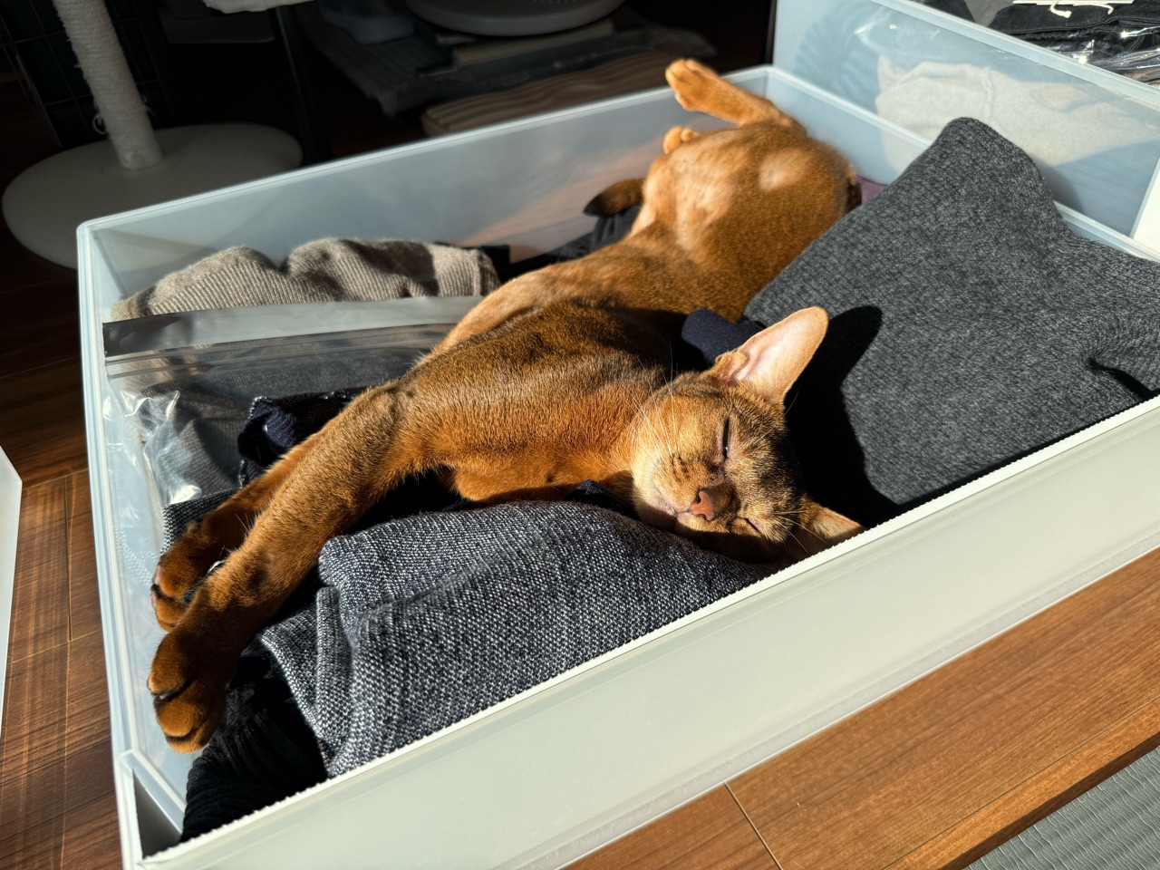 ぼくちんは、衣替え途中の引き出しで寝てるし。