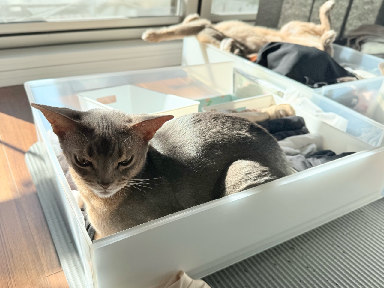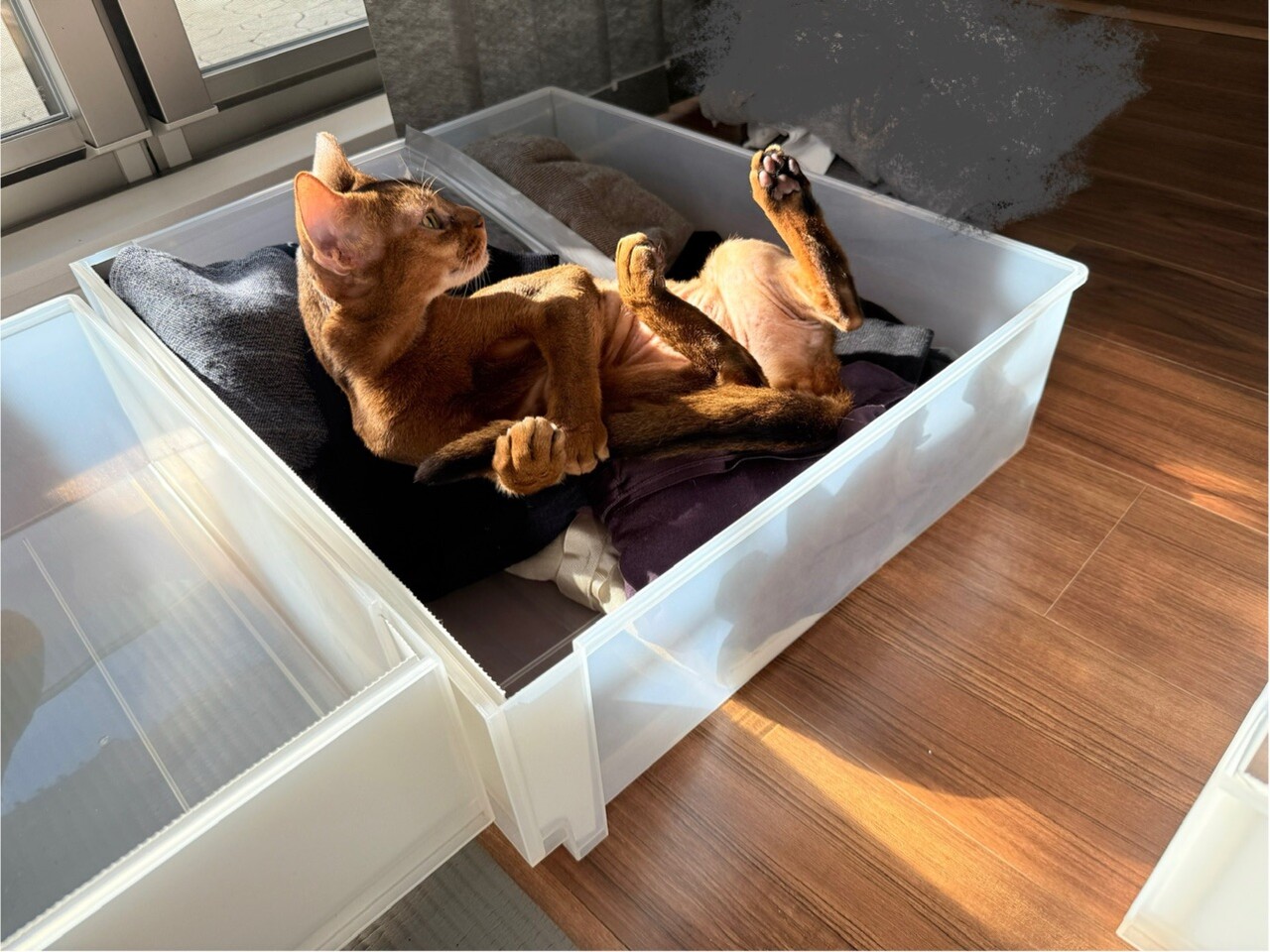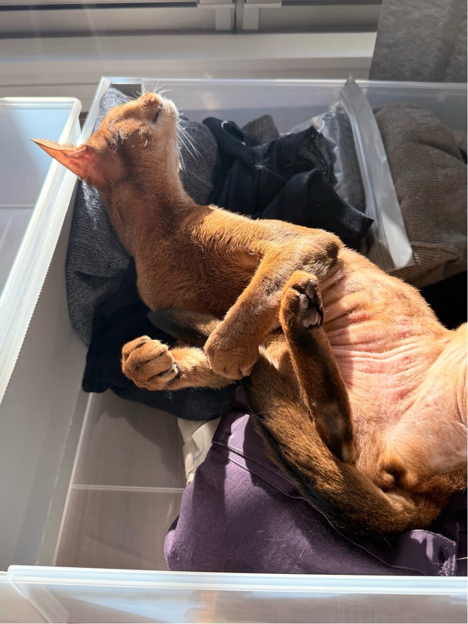 ぼくちんは、衣替え途中の引き出しで寝てるし。