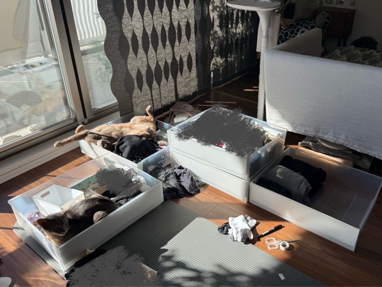 引き出しを取り出してきて並べて、中身を夏物と冬物に入れ替えるだけの作業なんですが、まぁ、進まない…