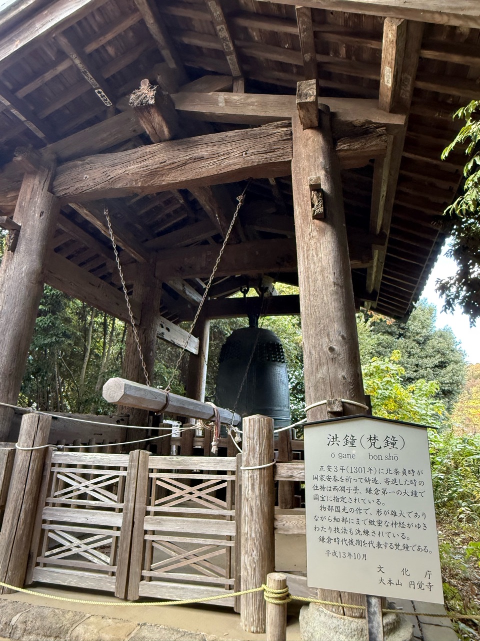 関東で最も大きい洪鐘(高さ259.5cm)で、国宝に指定されています。円覚寺の開基である北条時宗の子である貞時が正安3年(1301)、国家安泰を祈願して寄進したものです。