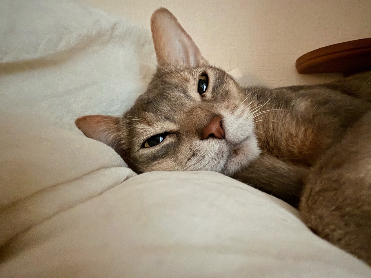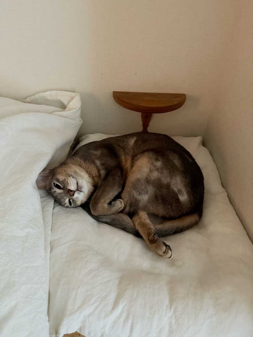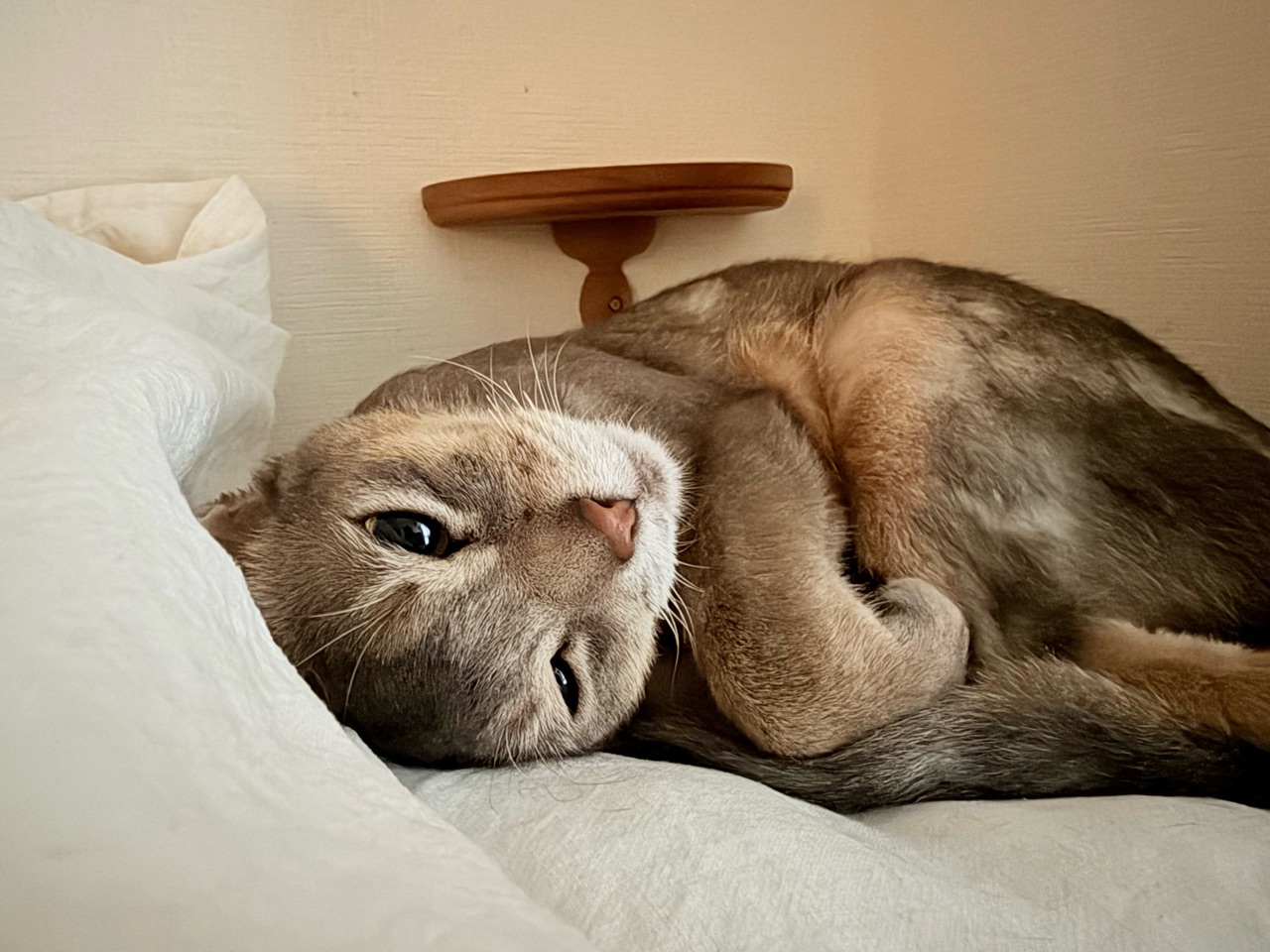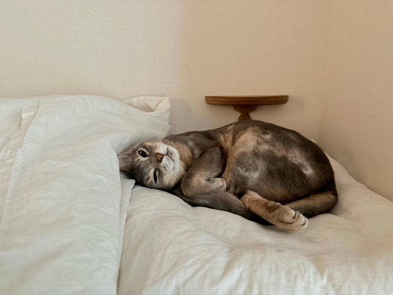飼い主が起きても、まだベッドで寝てた。