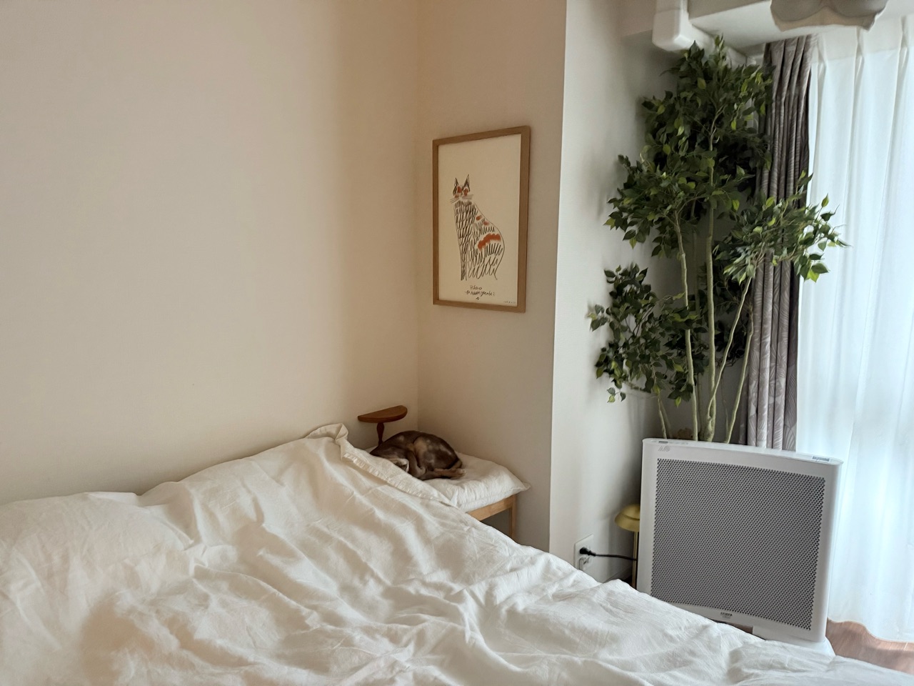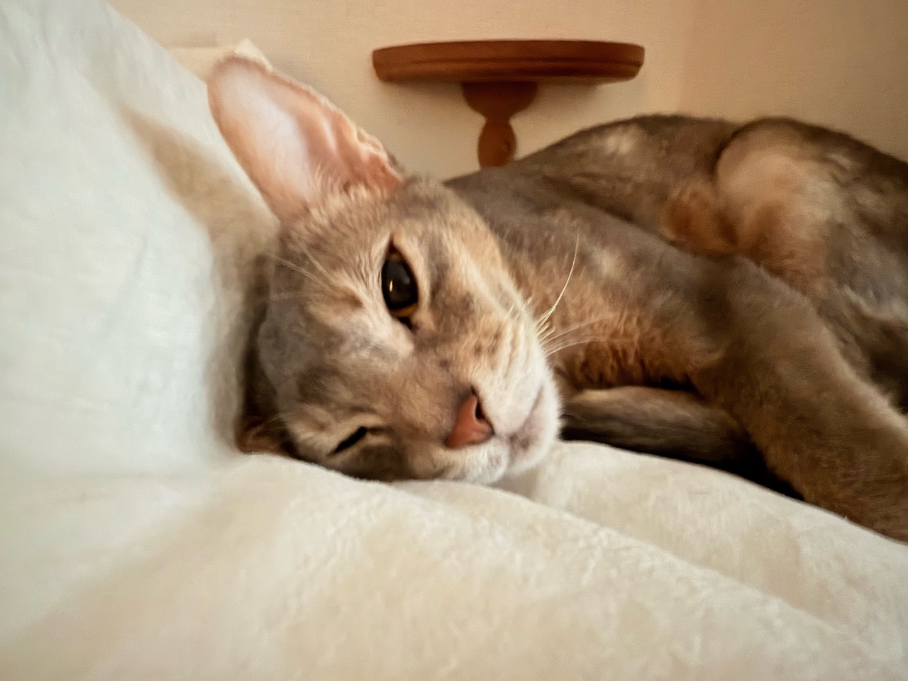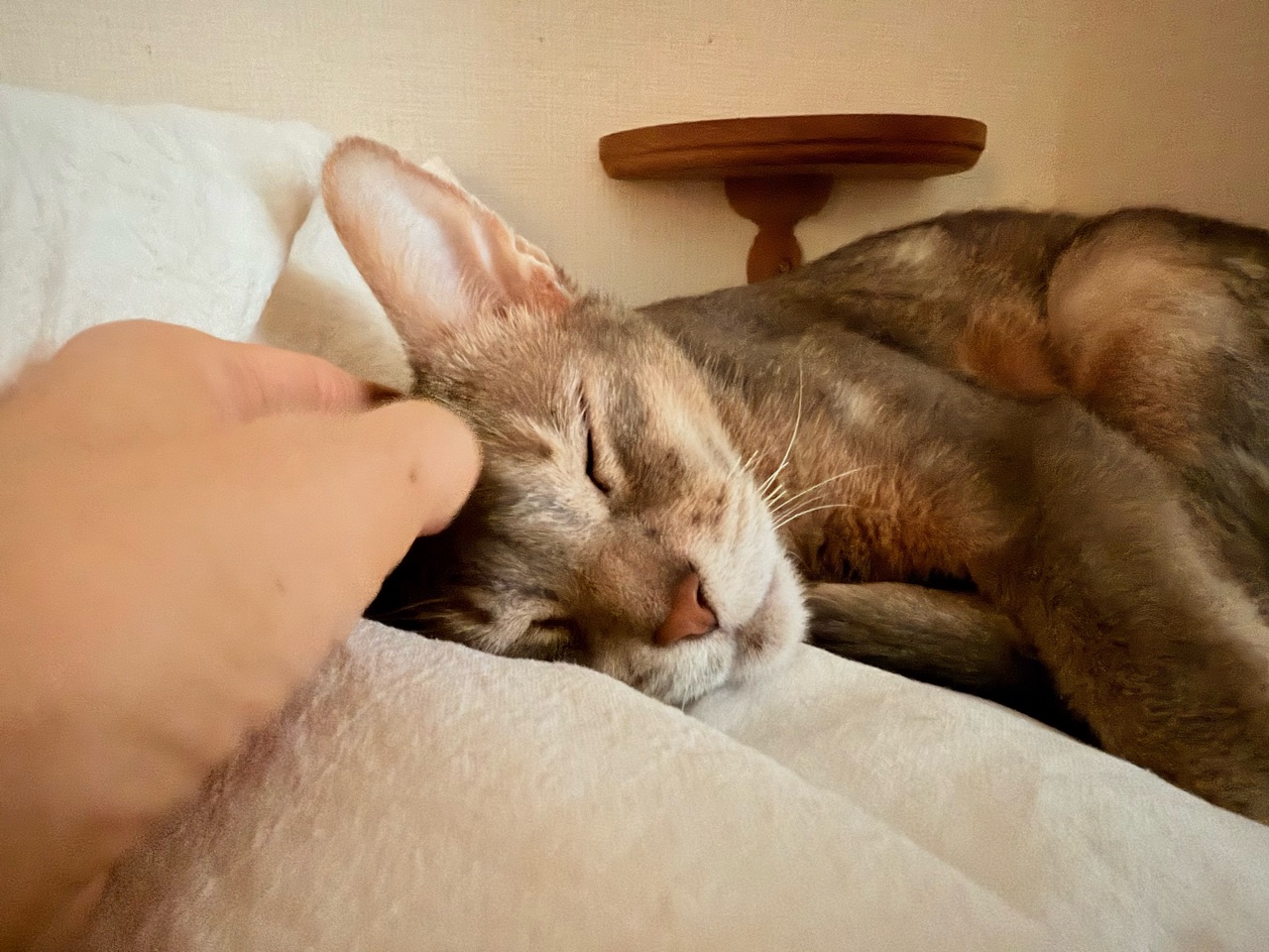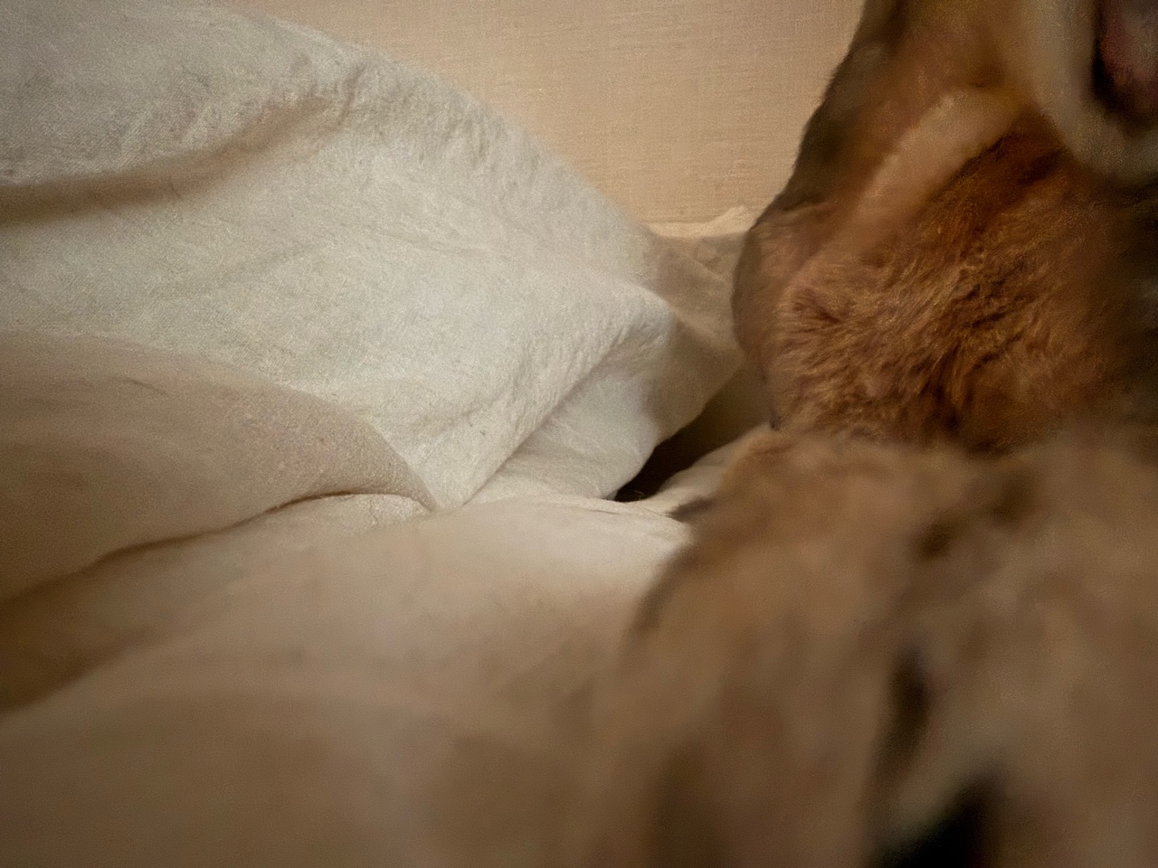 飼い主が起きても、まだベッドで寝てた。