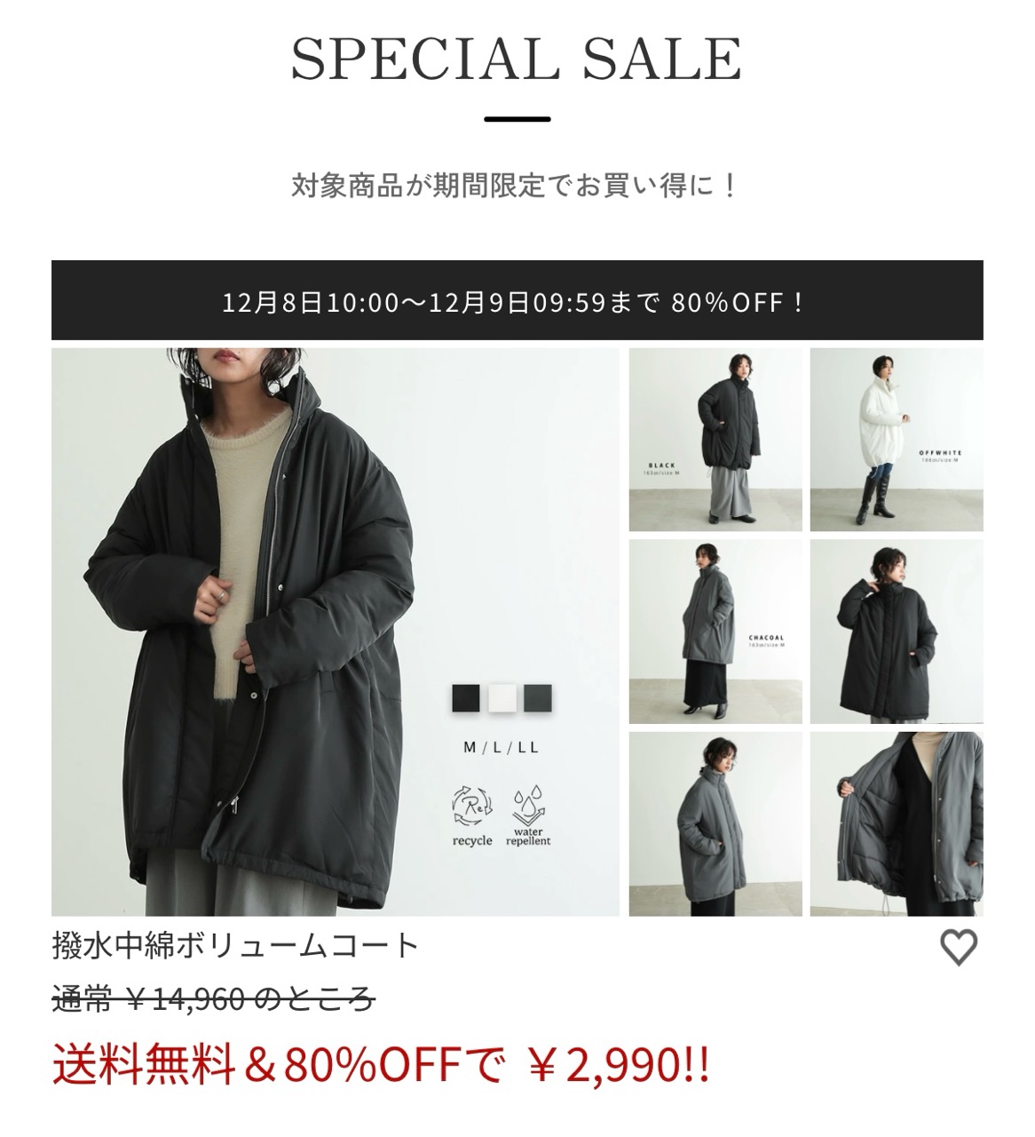 撥水の中綿コートが14,960円が2,990円になってる。