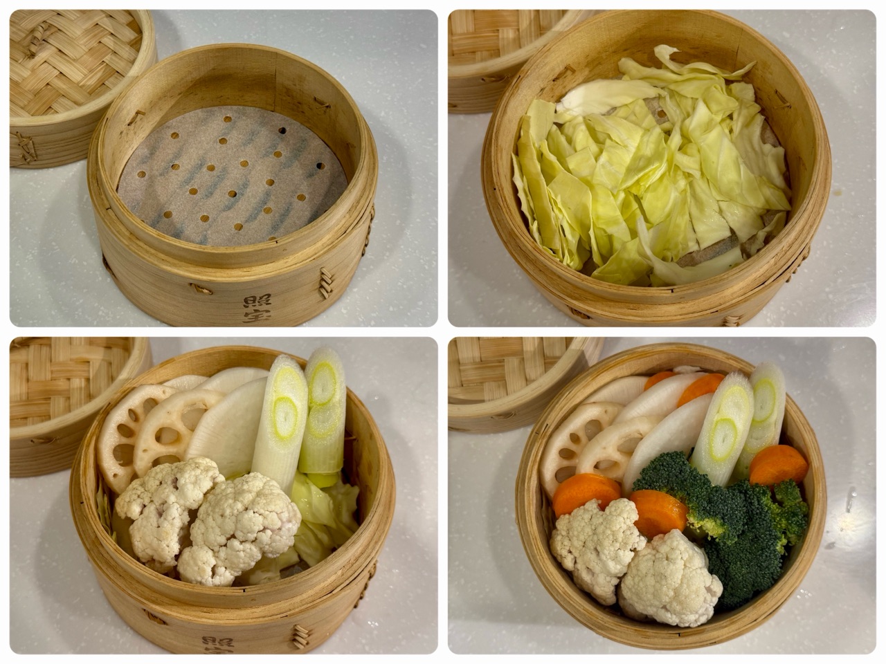 ③大根と蓮根を交互に並べて(蒸気が抜けやすいように空間を作る)、カリフラワーとネギを置いて