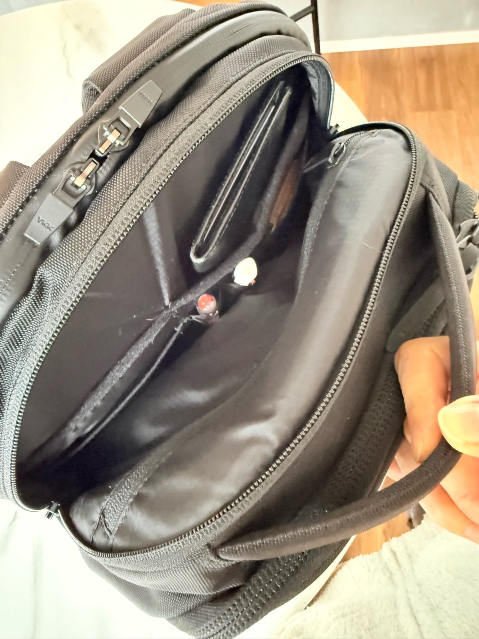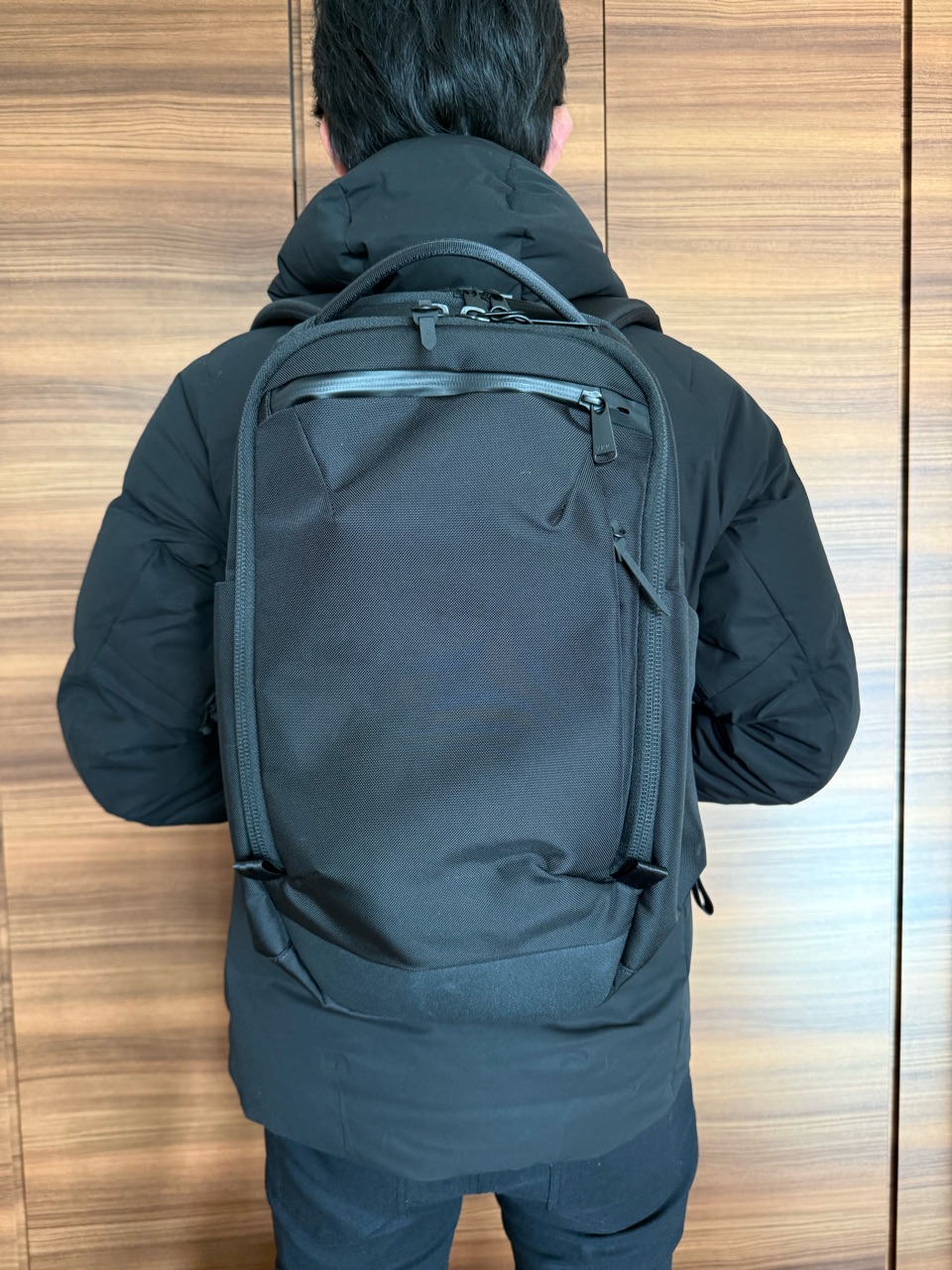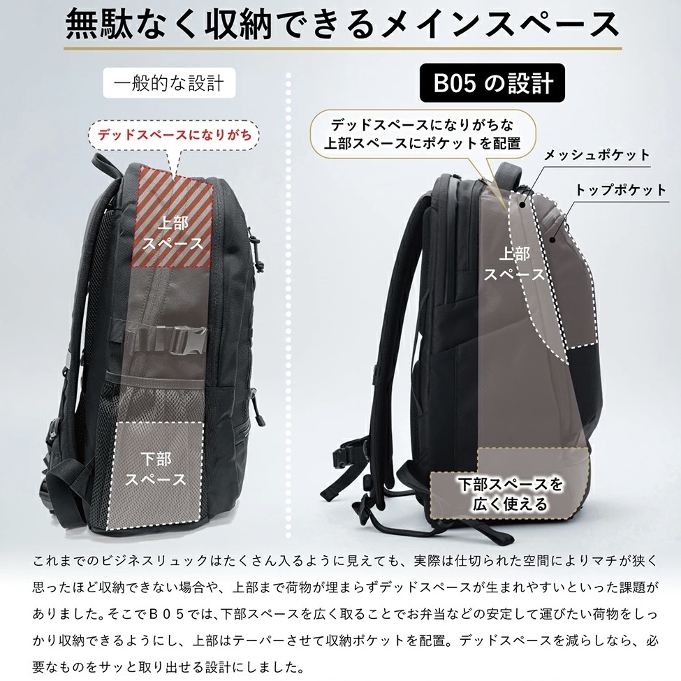 大容量ながら、デッドスペースを作らない構造で、背負った時にスッキリとコンパクトに見えます。