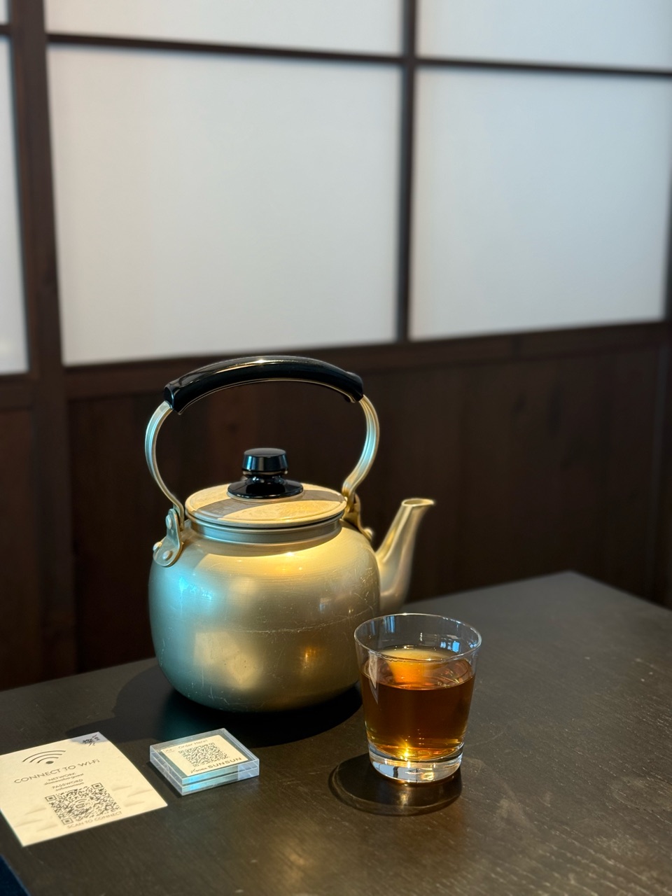 お茶の入れ物がレトロだけど、注文はQRコードでするハイテク仕様でした。