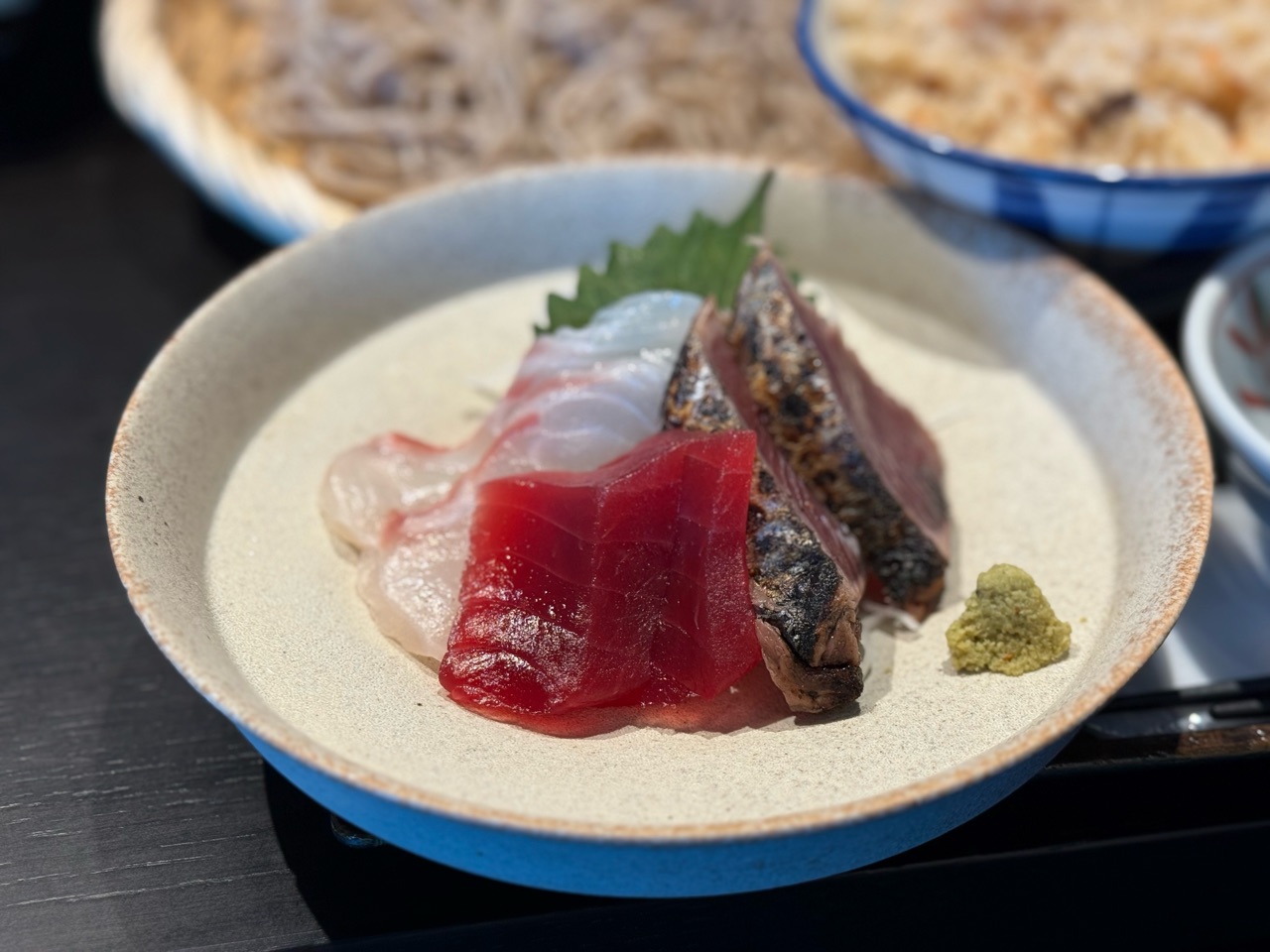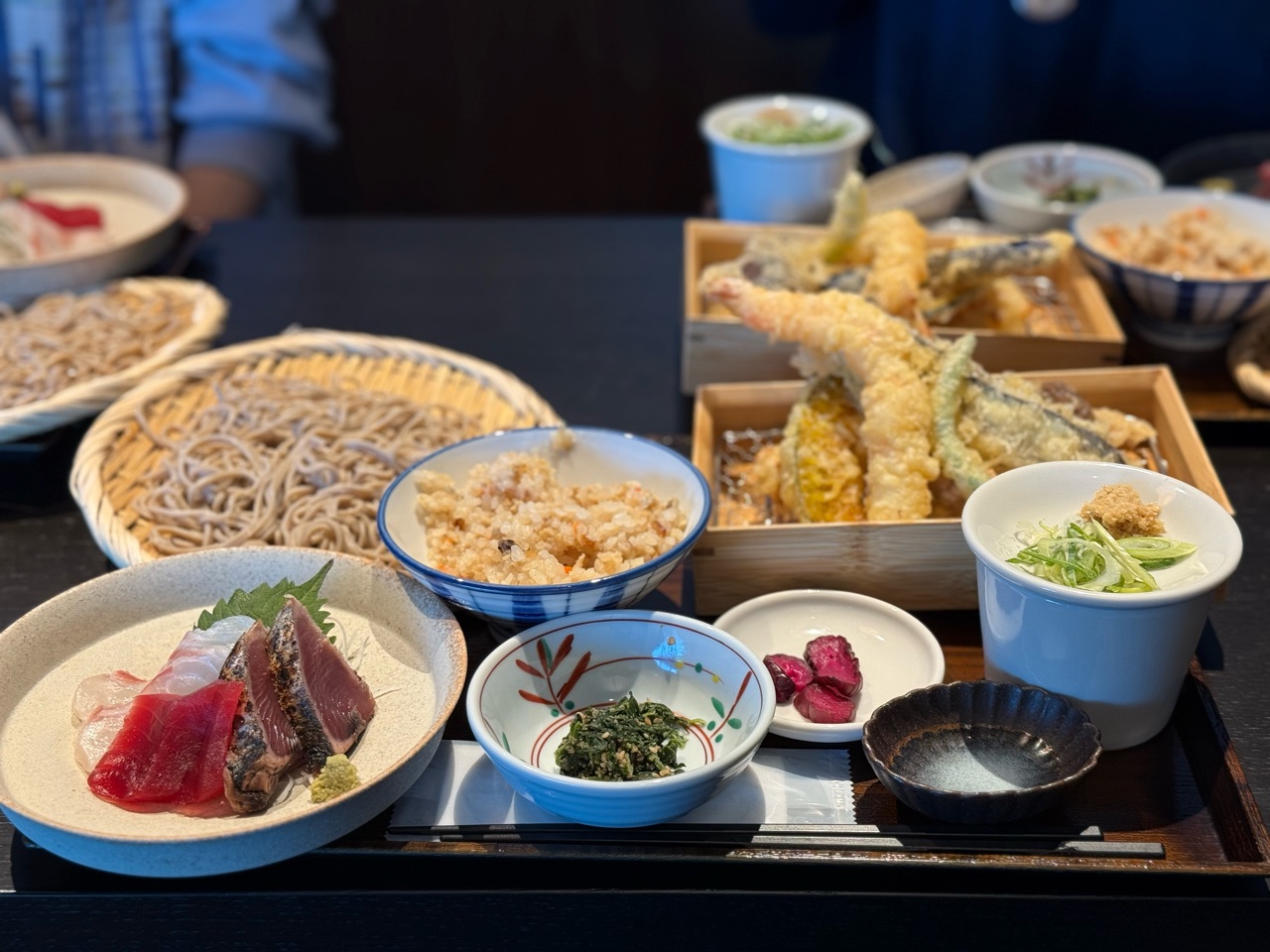 お蕎麦に、天ぷら、お刺身、かしわ飯(白米も選べる)、小鉢、甘味がセットになってます。