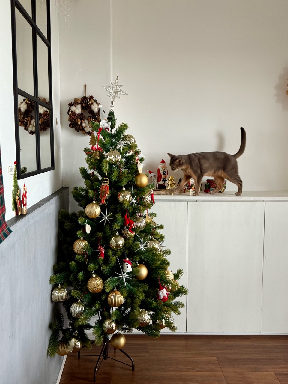 クリスマスツリー、ガラスの素敵なオーナメントや壊れやすいものとかは飾れないけど、それなりに楽しんでます♪