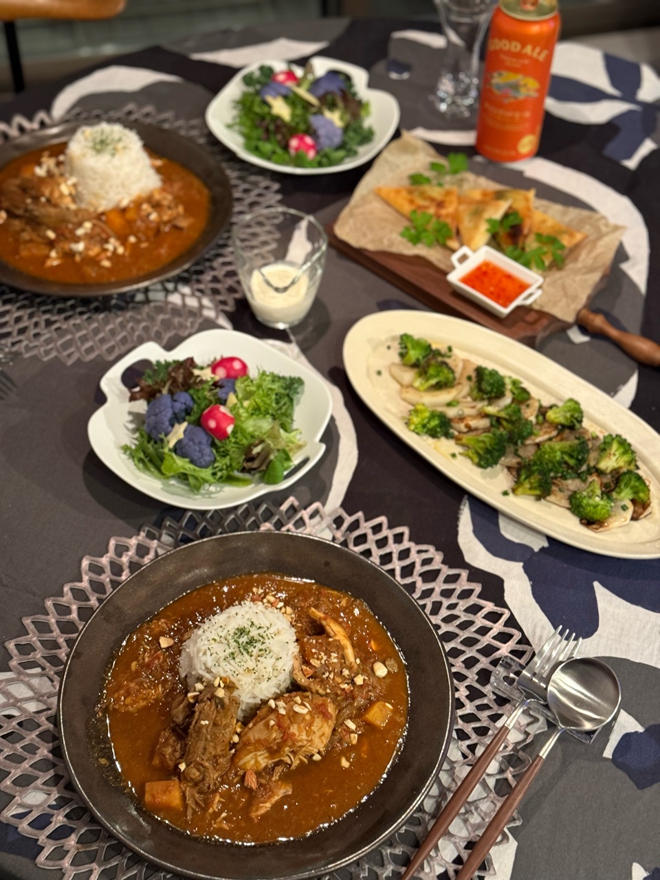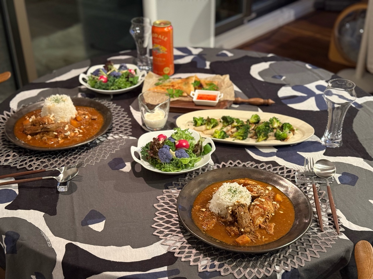 2025年12月26日 クリスマスチキンリメイクカレーの夜ごはん 今日の夜ごはんです。クリスマスに作ったチキンの丸焼きが半分ほど残ったので、チキンカレーにリメイクしました。STAUB鍋で玉ねぎとスパイスを油でじっくりと炒めて、残ったチキンとお水とトマト缶を入れて、コトコトと煮て、塩胡椒、醤油、蜂蜜、バイヨンで味を整えました。昨日の残りのサラダを盛り付け直しました。スーパーマリオみたいになりました。ブロッコリーツリーも残ったので、2品にリメイクしました。ブリッコリーのカルパッチョ風、ブロッコリートッピング。ポテトサラダの残りを腹巻きに包んで揚げもの。チキン余すことなく食べられました。今日も隣にきたわか坊。好きなものがないようで、ブー垂れてた。\つまんないでち/食後、パパのお膝でお耳ないないされてた。わか坊のお耳どこ行っちゃったのかな?\ここでち/おぉ、デッカいお耳だ。 「├ 日々のごはん」カテゴリの最新記事 < 前の記事次の記事 > コメント コメント一覧 (2) 1. ビビアン 2025年12月27日 11:27 既にじっくり焼き上げているチキンのカレー、めっちゃ美味しそう🤭 水玉ラディッシュは先日のきのこりすたんみたいですね😘 わかちゃんのお耳、パパのなすがまま🤣🫶 0 jolijolidayo がしました 2. joli!joli! 2025年12月27日 18:35 >>1 焼いたチキンでお出汁でるかなー?ってちょっと心配だったけど、骨付きのままコトコトと炊いたら美味しくできました✨ ほんとだ🤣 🍄のりすたんみたい♡ お眠のわか坊は、やられ放題でした😂 0 jolijolidayo がしました コメントフォーム 名前 コメント 記事の評価 リセット リセット 顔 星 情報を記憶 コメントを投稿する