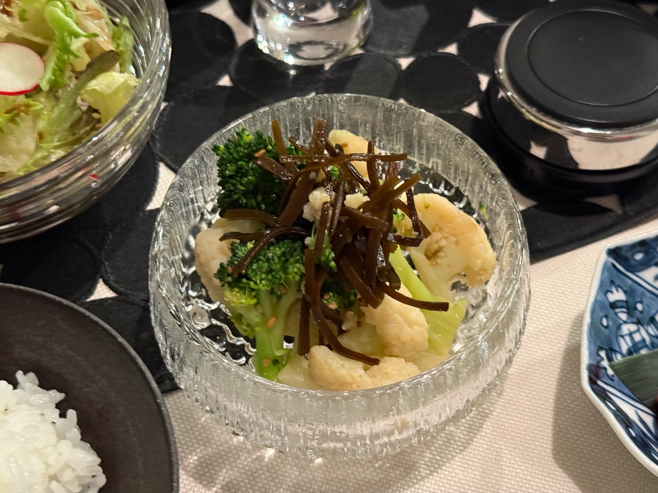 ブロッコリーとカリフラワーの、塩昆布のごま油和え