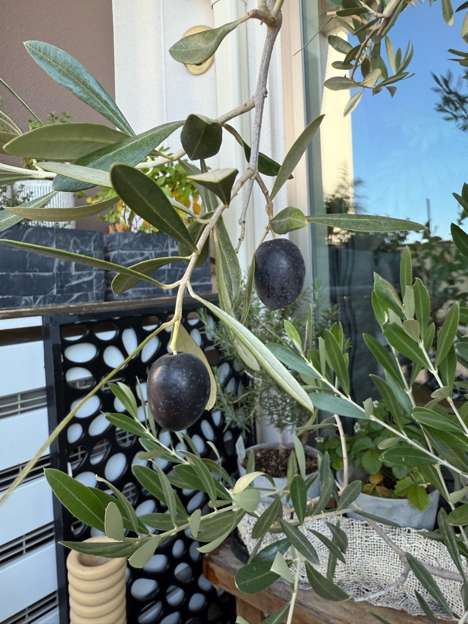 ベランダのオリーブの実が真っ黒になったので、収穫しました。