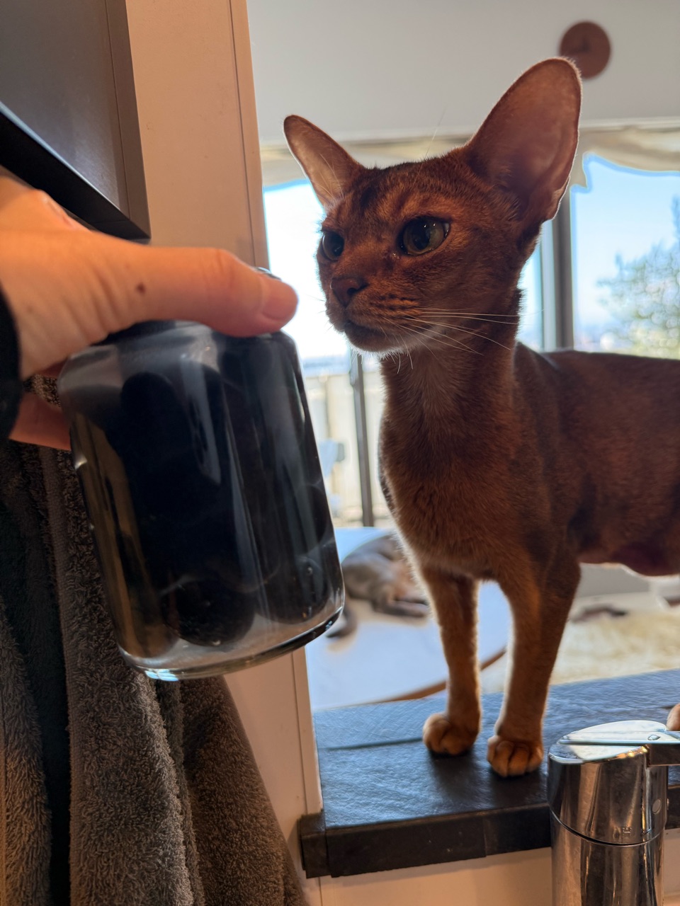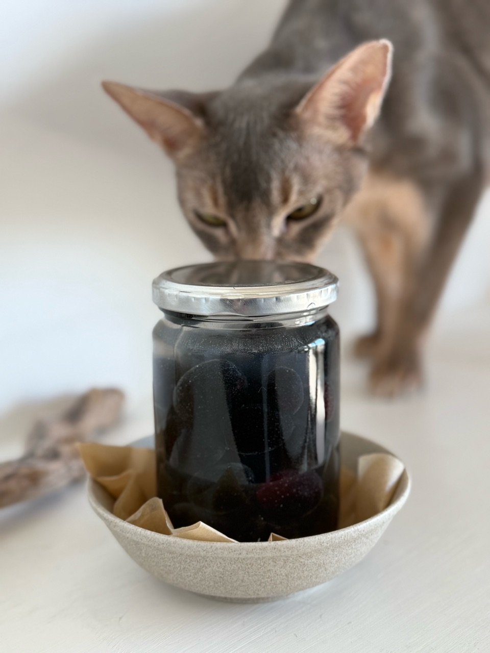 オリーブの瓶にも、興味津々のりすたん。