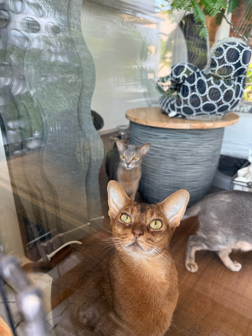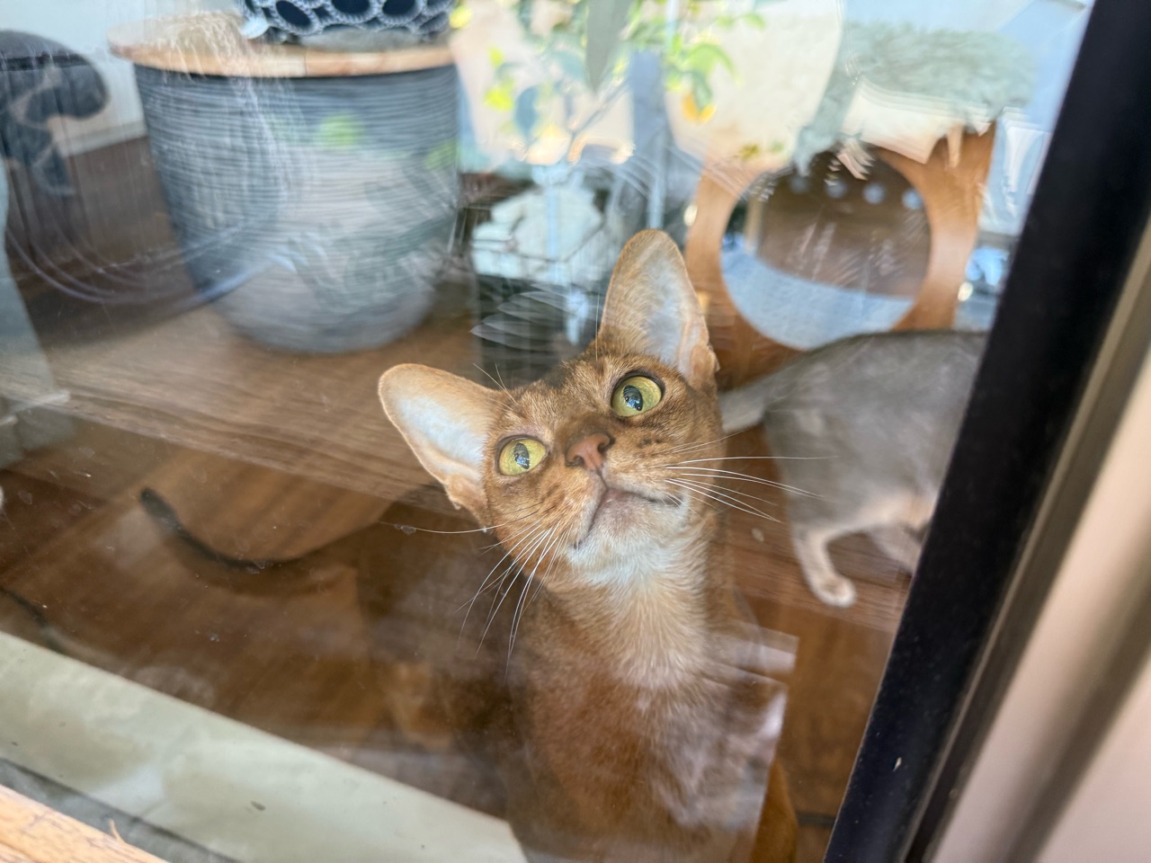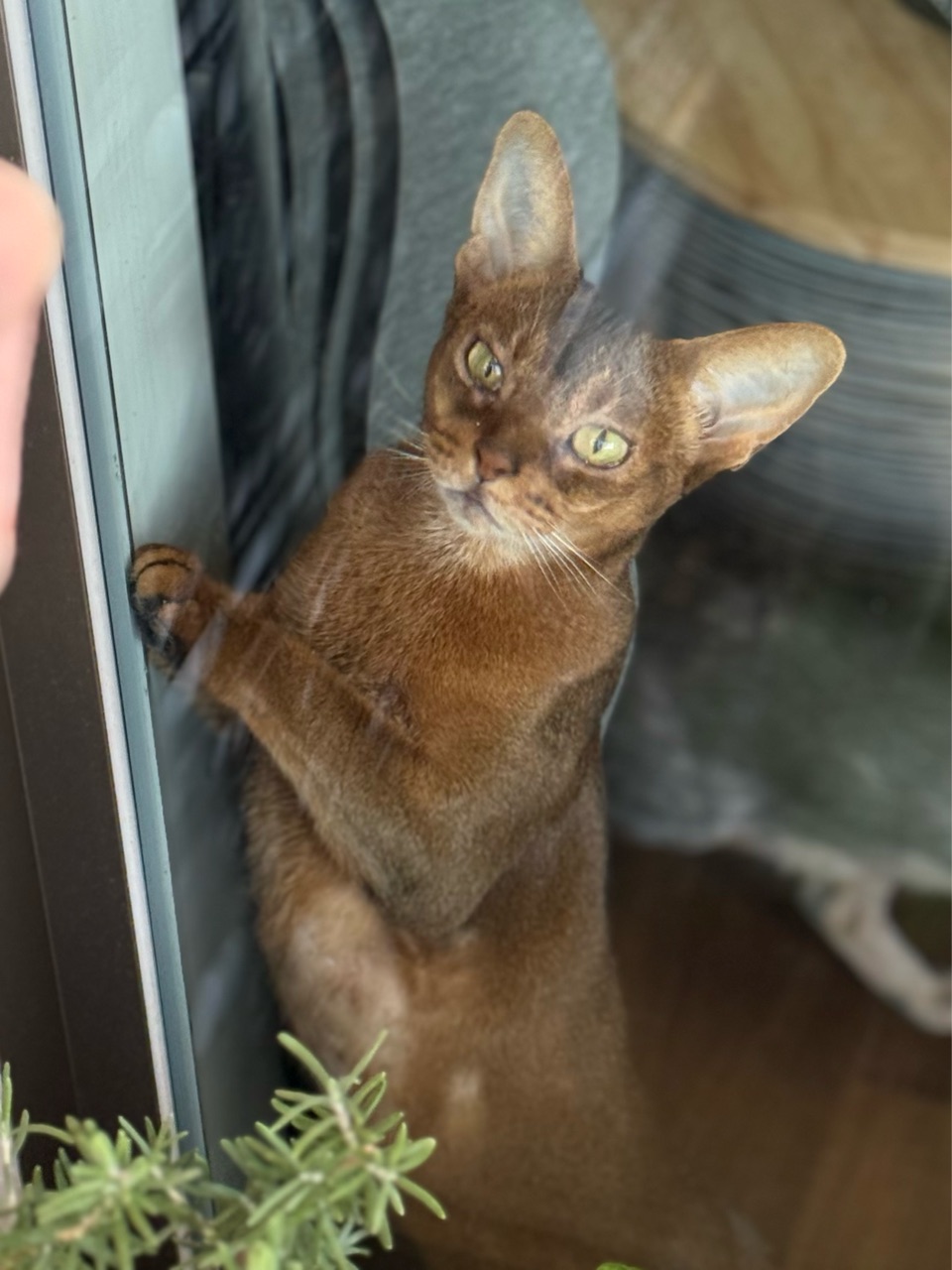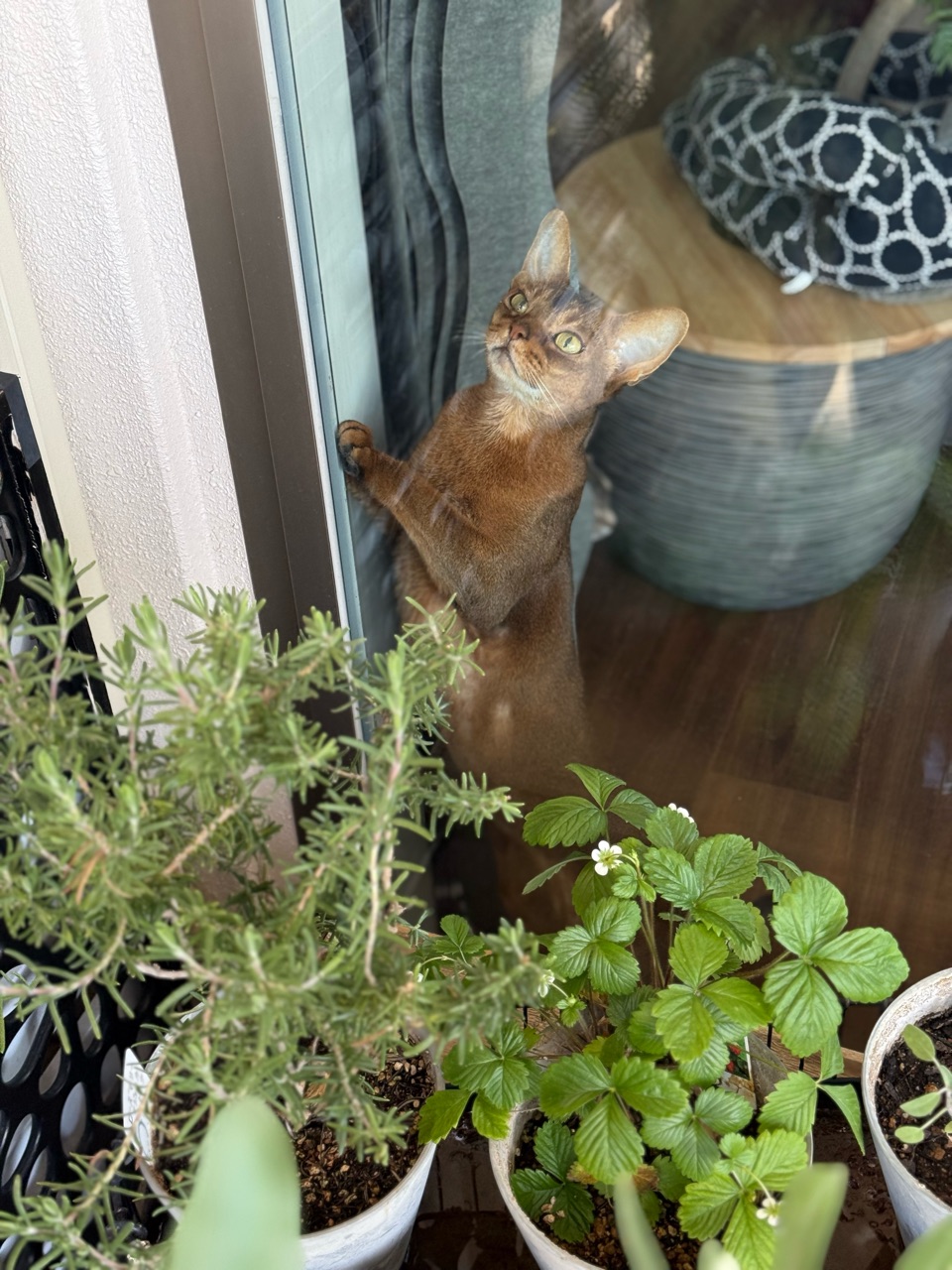 オリーブを収穫していると、お外を眺めるのが大好きなりすたんが窓際にやってきた。