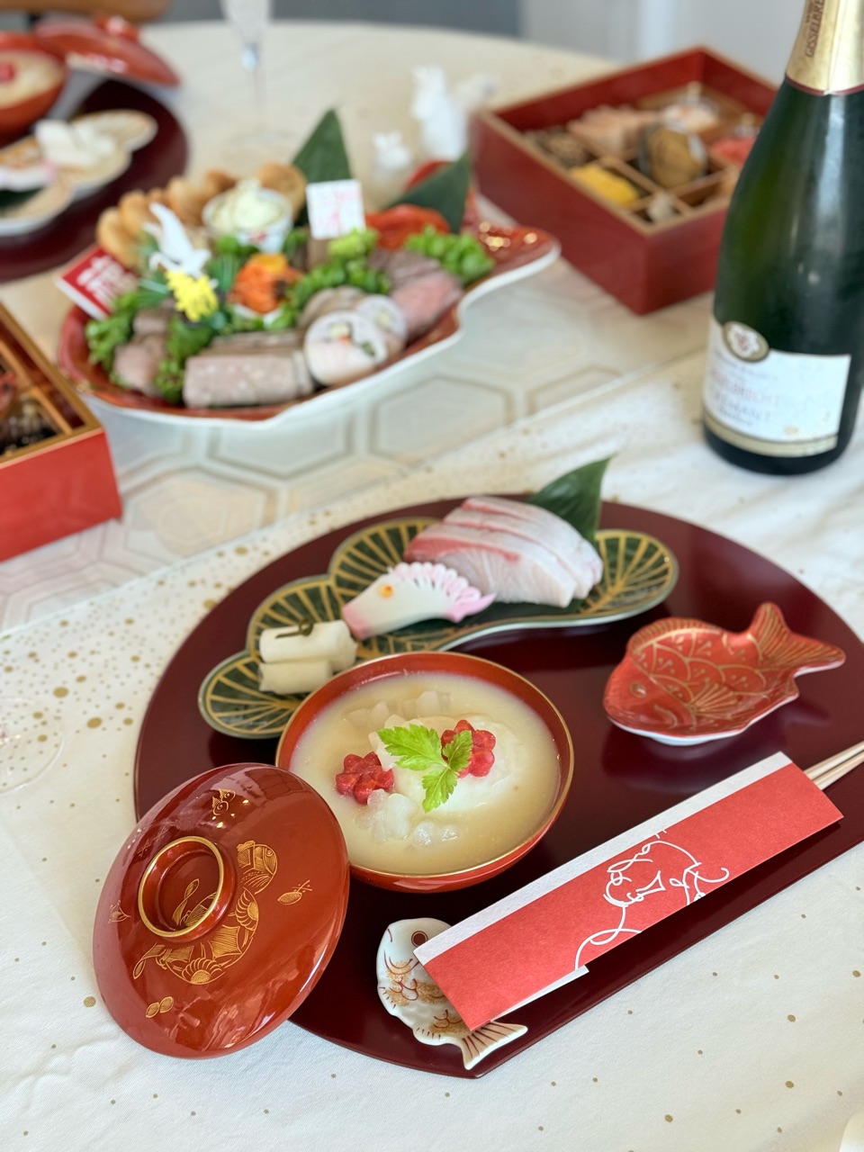 お雑煮とおせちを並べて、お昼ごはんにしました。