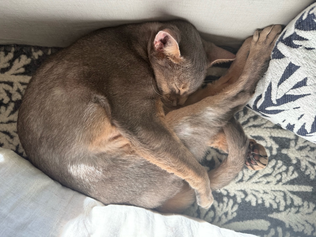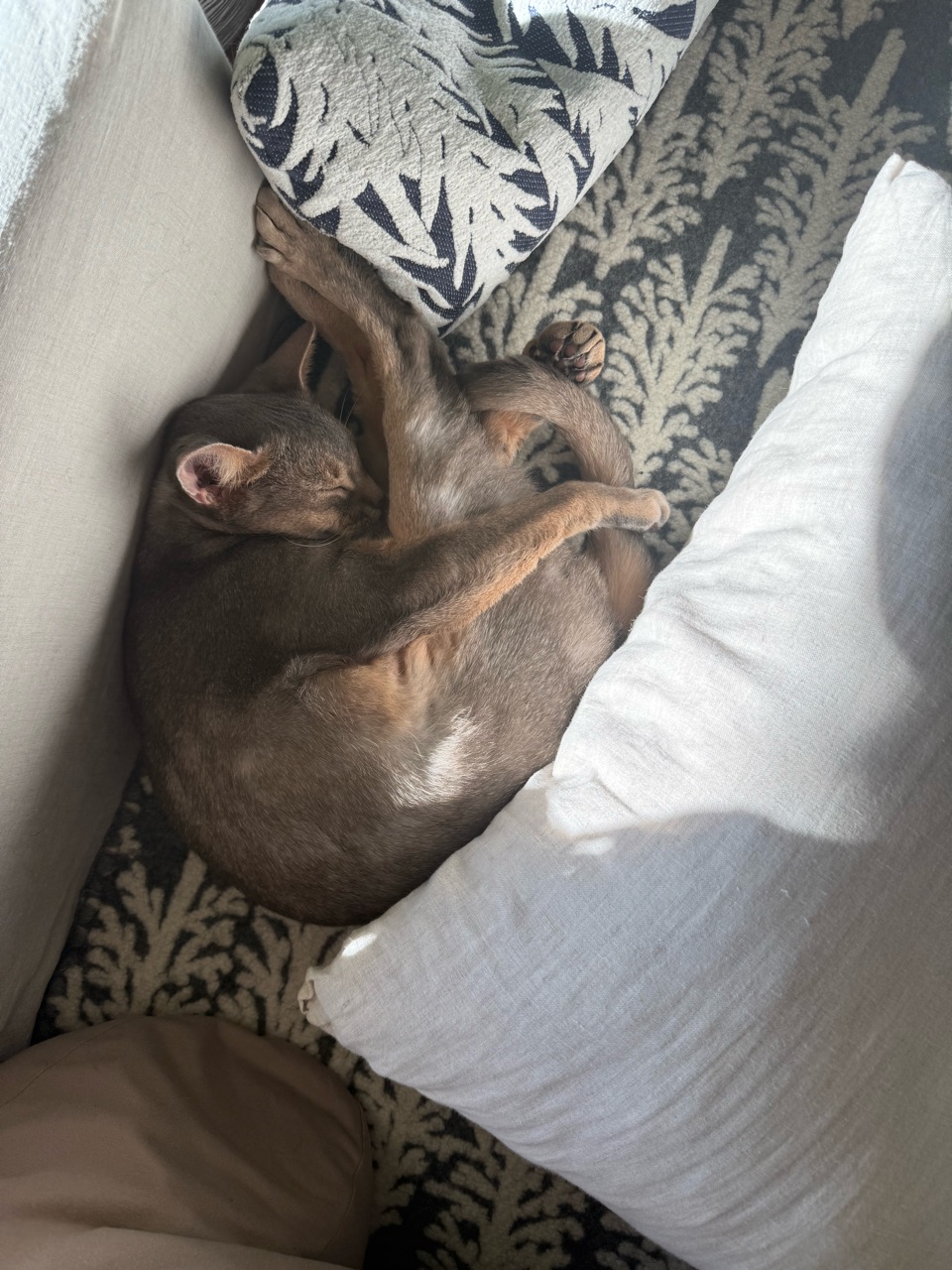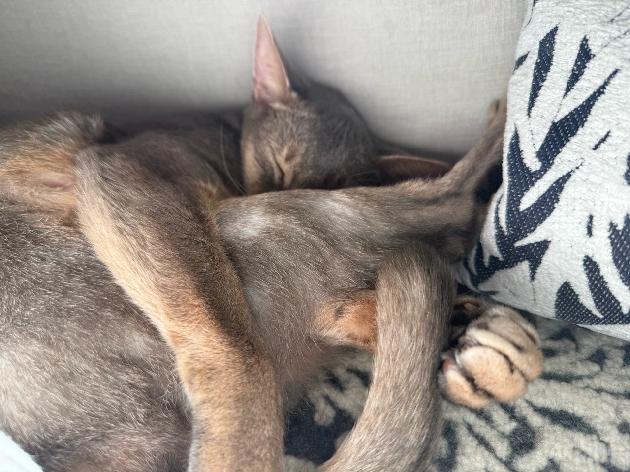 ソファーのお気に入りスペースで、お昼寝中のぼくちん。