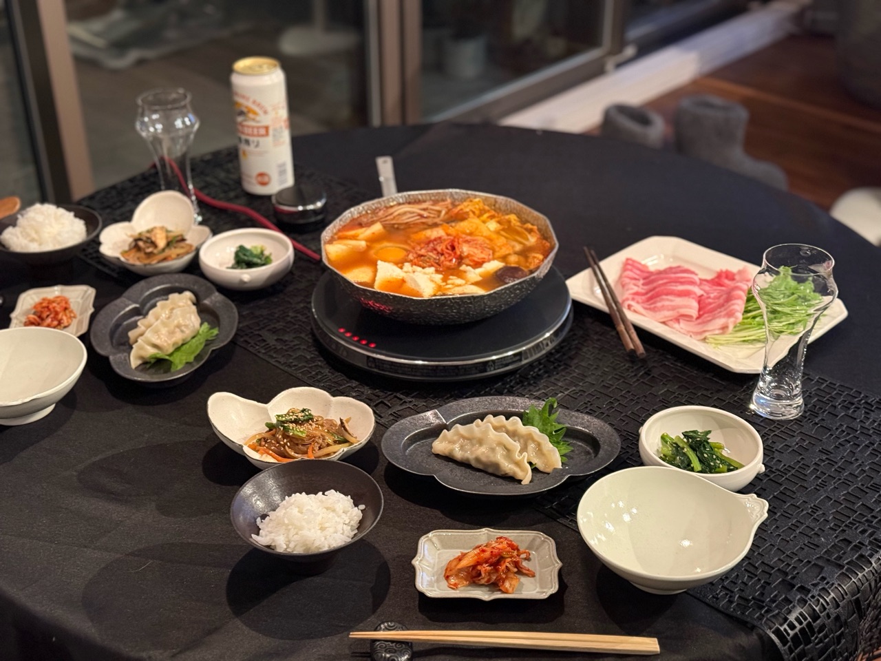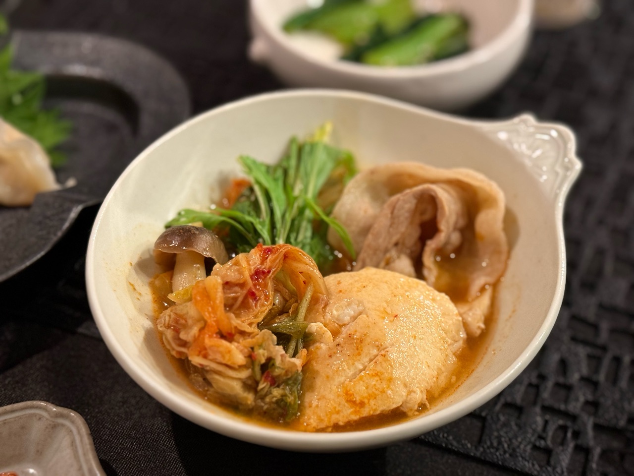 野菜たっぷり、豚バラ肉、白菜キムチ、お豆腐とたまごを入れました。
