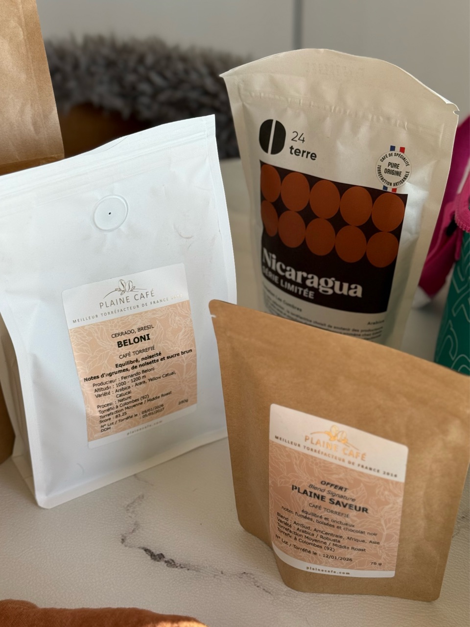 サンラザール駅にある、「PLAINE CAFE」というコーヒー豆屋さんのコーヒー豆と、モノプリのコーヒー豆。