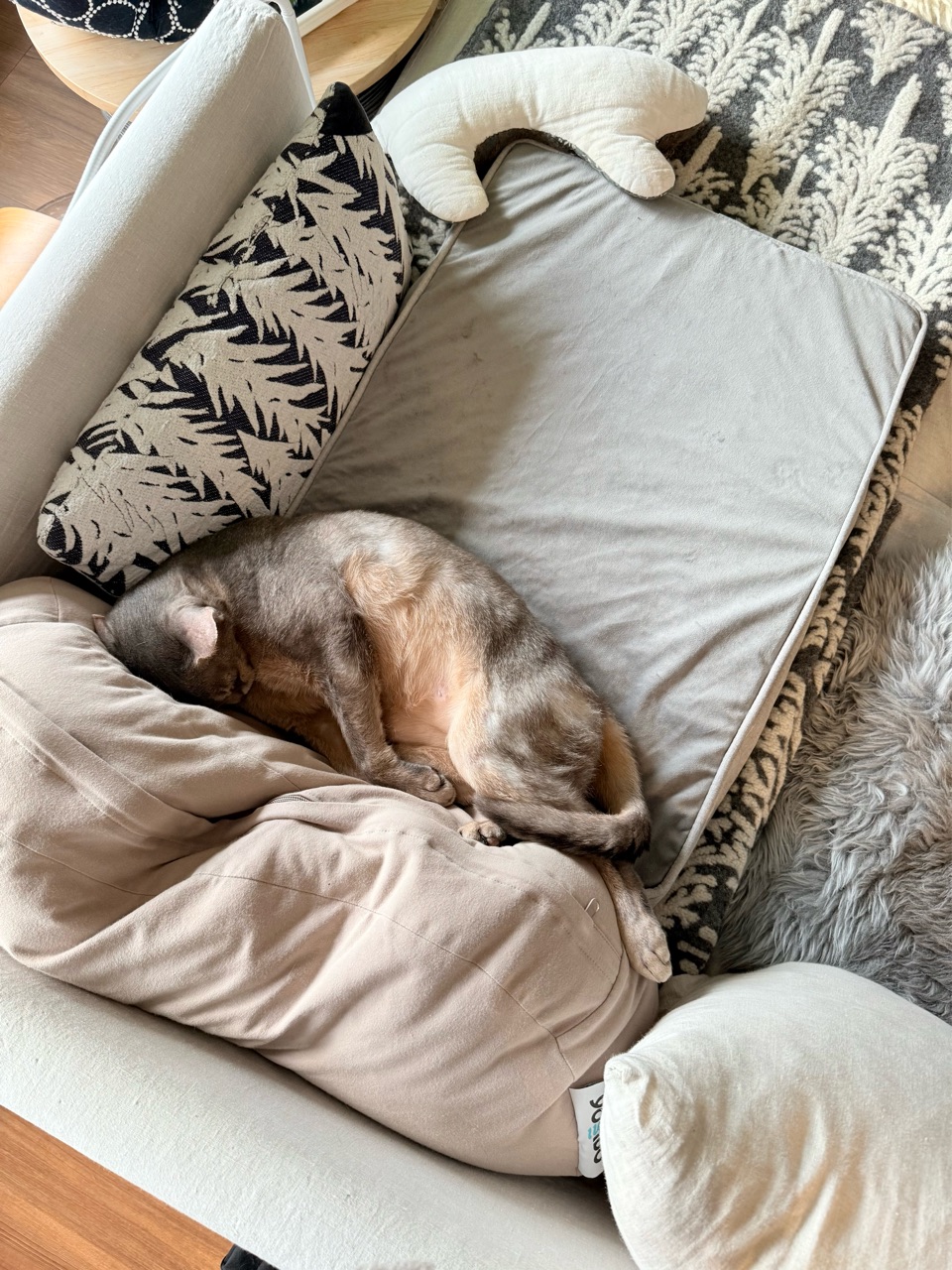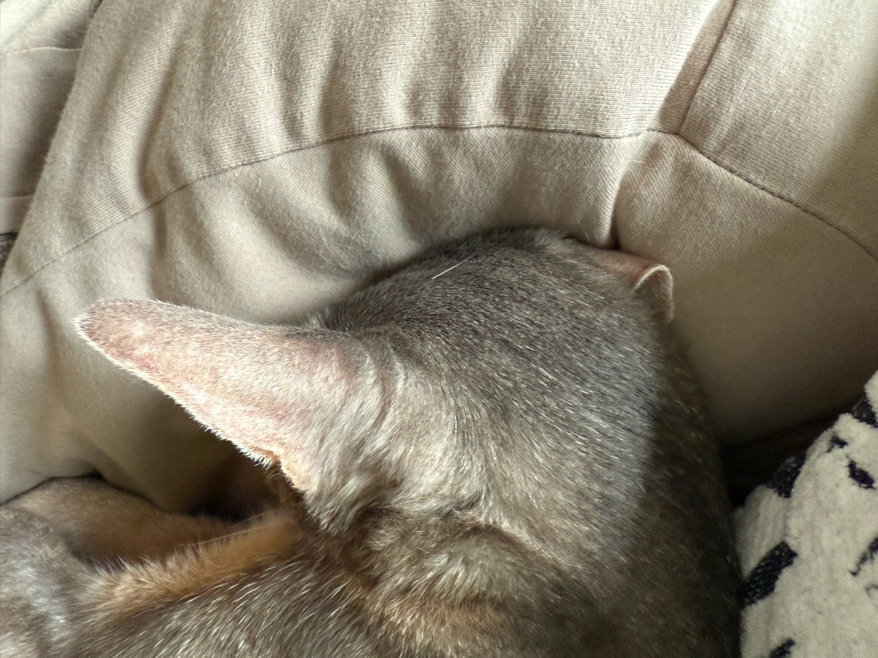 さっきまで伸びーっと伸びてたけど、次に見たら片隅でクッションに頭をくっつけてた。