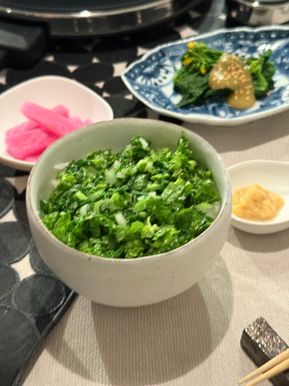 ごはんは、前の日にお店で食べて美味しかったのを真似して作った菜の花ごはん。