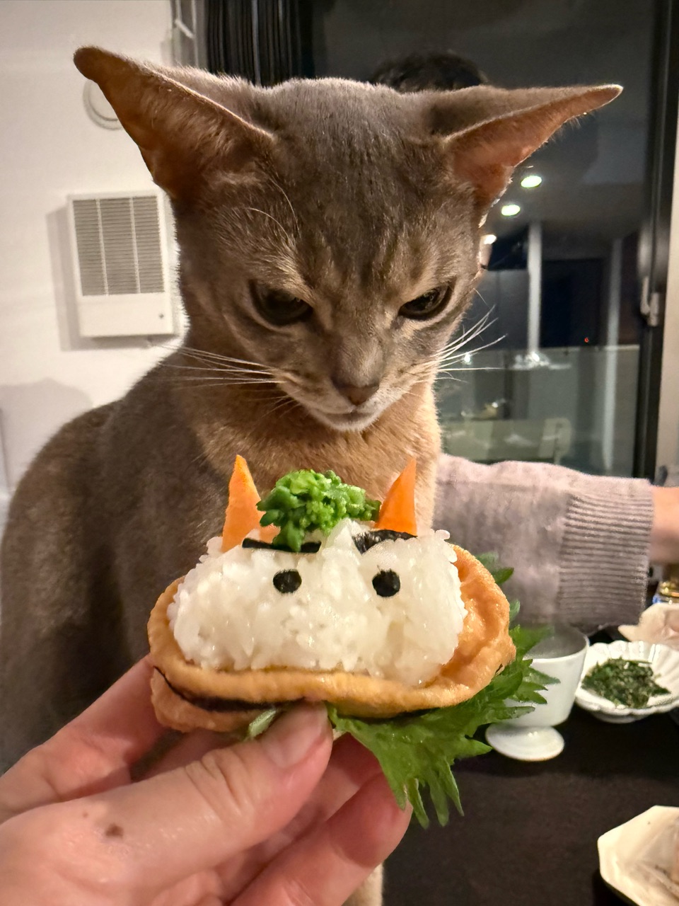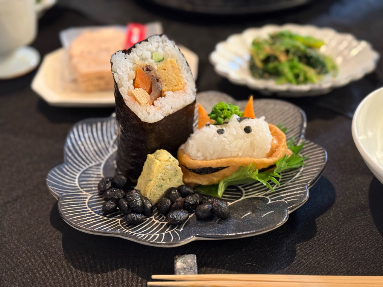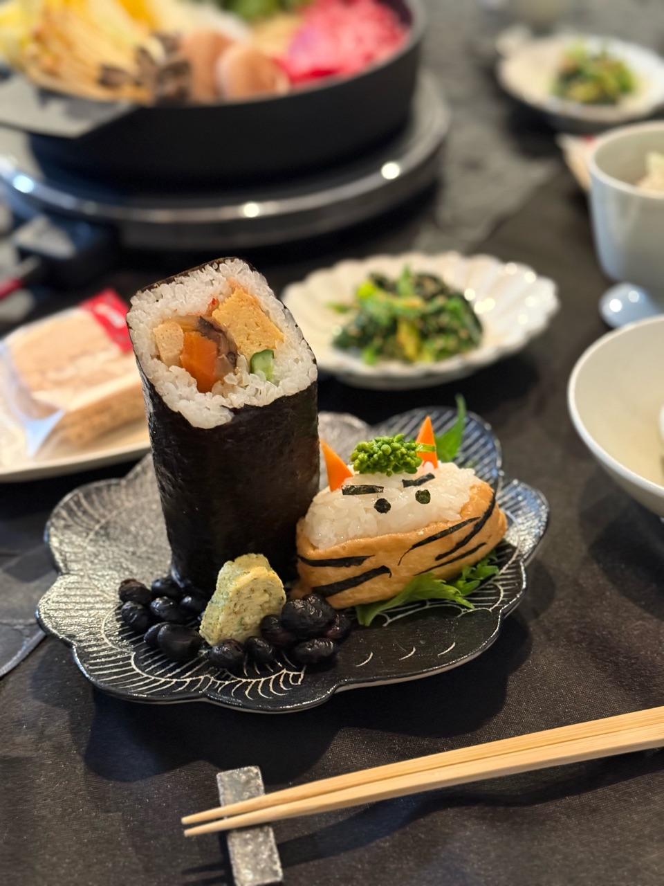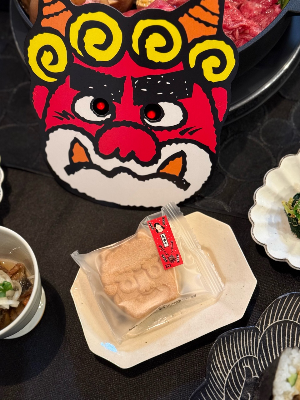 2026年02月03日 節分2026の夜ごはん 恵方巻きと鬼さんいなりとすき焼き 今日は節分なので、恵方巻きを買いました。恵方巻きは1本を半分こ。いなり寿司の鬼さんと一緒に並べました。鬼さん、恵方巻き、黒豆と卵焼きです。イワシのフライ(スーパーのお惣菜)をマリネにした。鰯も食べた♪ほうれん草の胡麻和えメインはすき焼き。白ごはんが欲しくなった(๑¯◡¯๑)\パパ、あっちみて棒食べてるでち…/これは恵方巻きと言うのだよ。わか坊、去年も見たじょ。\こいつ誰だよ。鬼さんだって?/\おりのほうが怖いじぇ!/\で、今日のおこぼれは何でちか⁉︎/ないじょ。\ありえないでち…/さて、おやつあげたら人間もおやつをいただくとしましょう。鬼さんの最中、中にお豆が入ってるらしいです。節分のお豆買い忘れたから、これでよしとしよう(๑¯◡¯๑) 「├ 季節料理」カテゴリの最新記事 < 前の記事次の記事 > コメント コメント一覧 (2) 1. ビビアン 2026年02月04日 08:51 グリーンヘアーの鬼さん可愛い🤭 恵方巻き、イワシ、お豆、、楽しく節分の食べ物クリアされましたね👍✨ わかちゃんにとってはパパママが食卓と違う方向向いて黙って恵方巻き食べてて、???と言う感じだったかな😂🩷 0 jolijolidayo がしました 2. joli!joli 2026年02月04日 22:16 >>1 菜の花のモケモケが良い感じのグリーンヘアーになりました🤣 節分の食べ物も、色々と工夫すると楽しいですね♪ 恵方巻きの習慣はいまだに慣れません😂 一本丸ごと食べ切るのは難しいですね(๑¯◡¯๑) 0 jolijolidayo がしました コメントフォーム 名前 コメント 記事の評価 リセット リセット 顔 星 情報を記憶 コメントを投稿する
