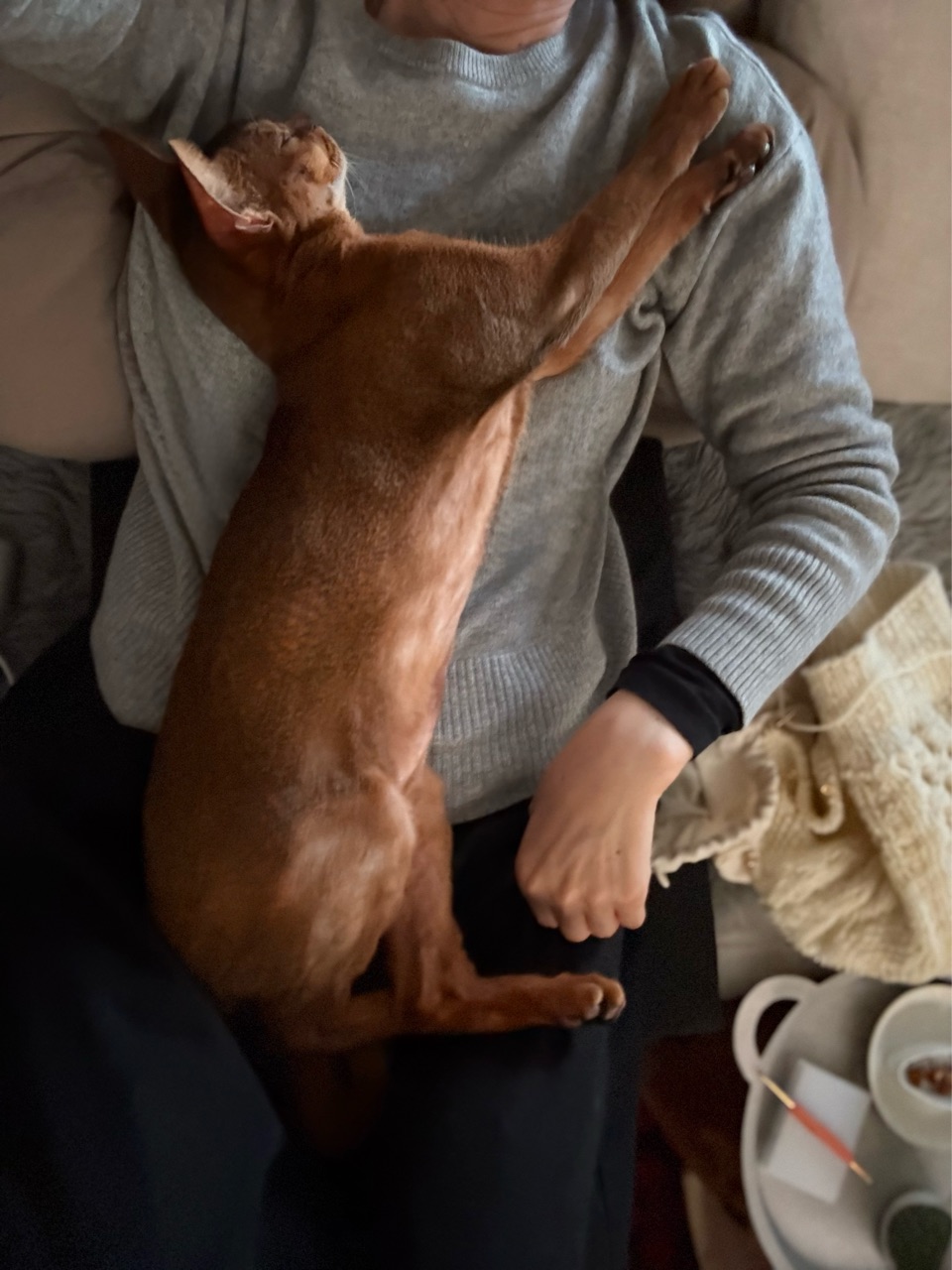 ソファーで編み物をしていたら、りすたんが編み途中のセーターを暖簾のようにくぐって胸の上に飛び込んできた。
